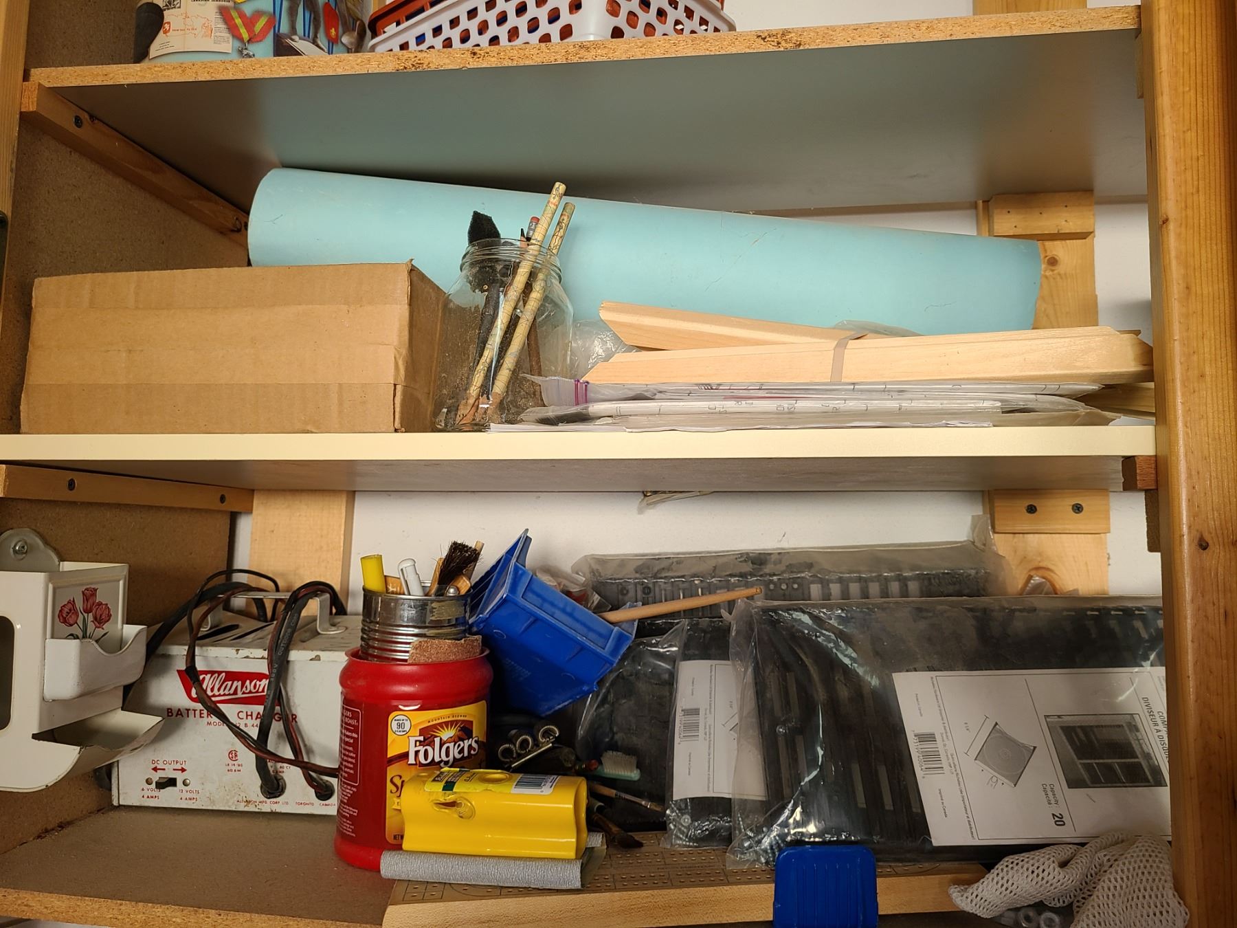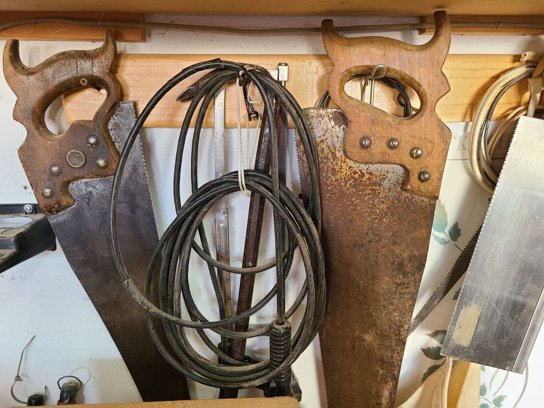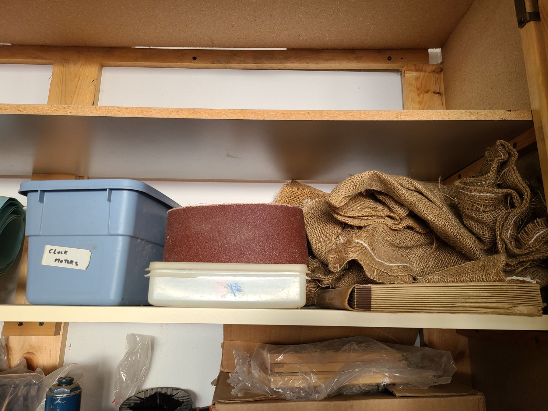 Assortment of hand tools, cords, small table, drawer, and contents of 2 cupboards above. Bring boxes. Pickup 9 am.