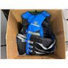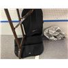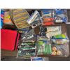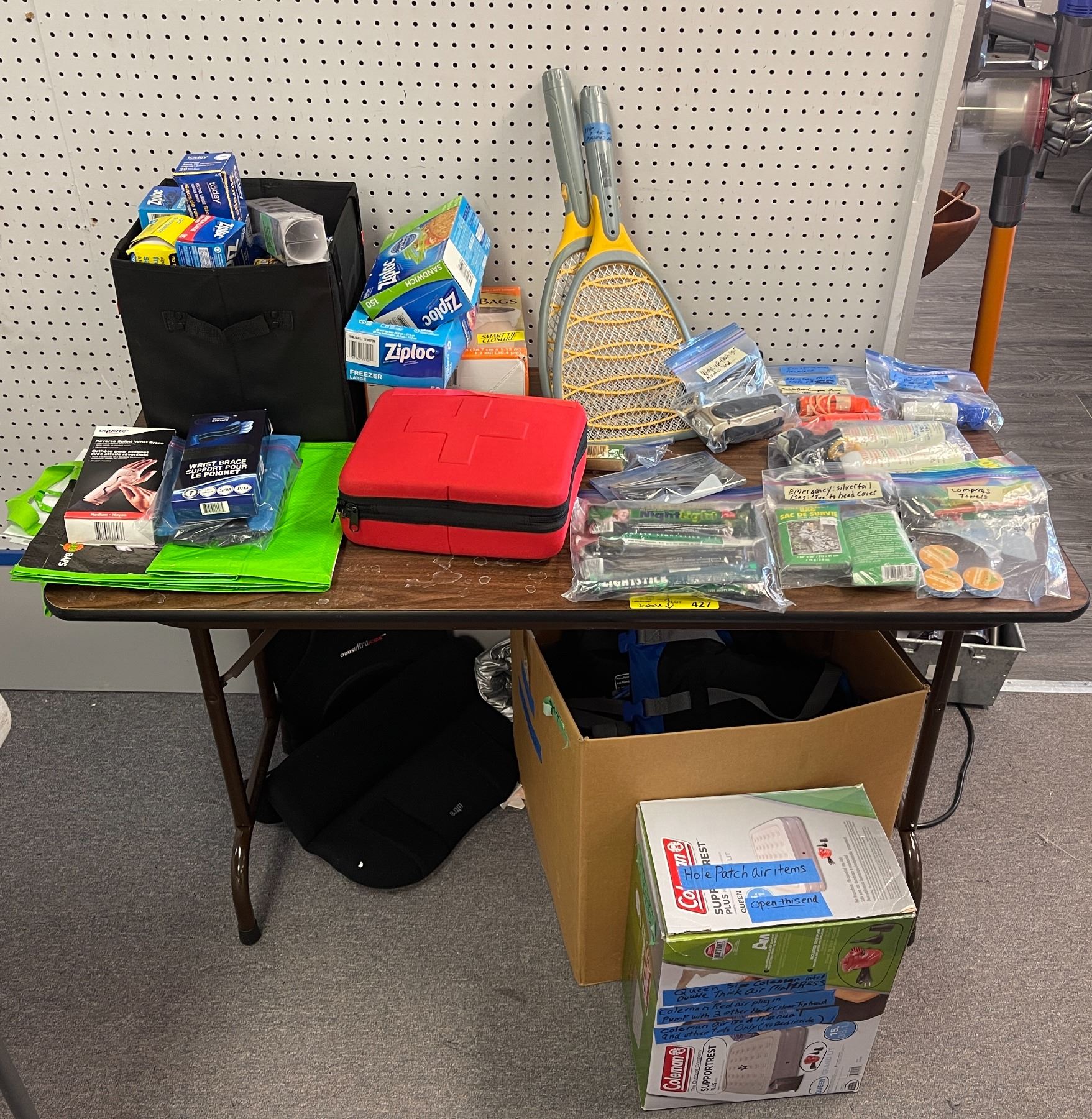 Table lot full of assorted misc items - includes Stinger bug zappers / windup flashlight / first aid kit / wrist braces / Outbound life jacket / UltraForme Backrest etc
