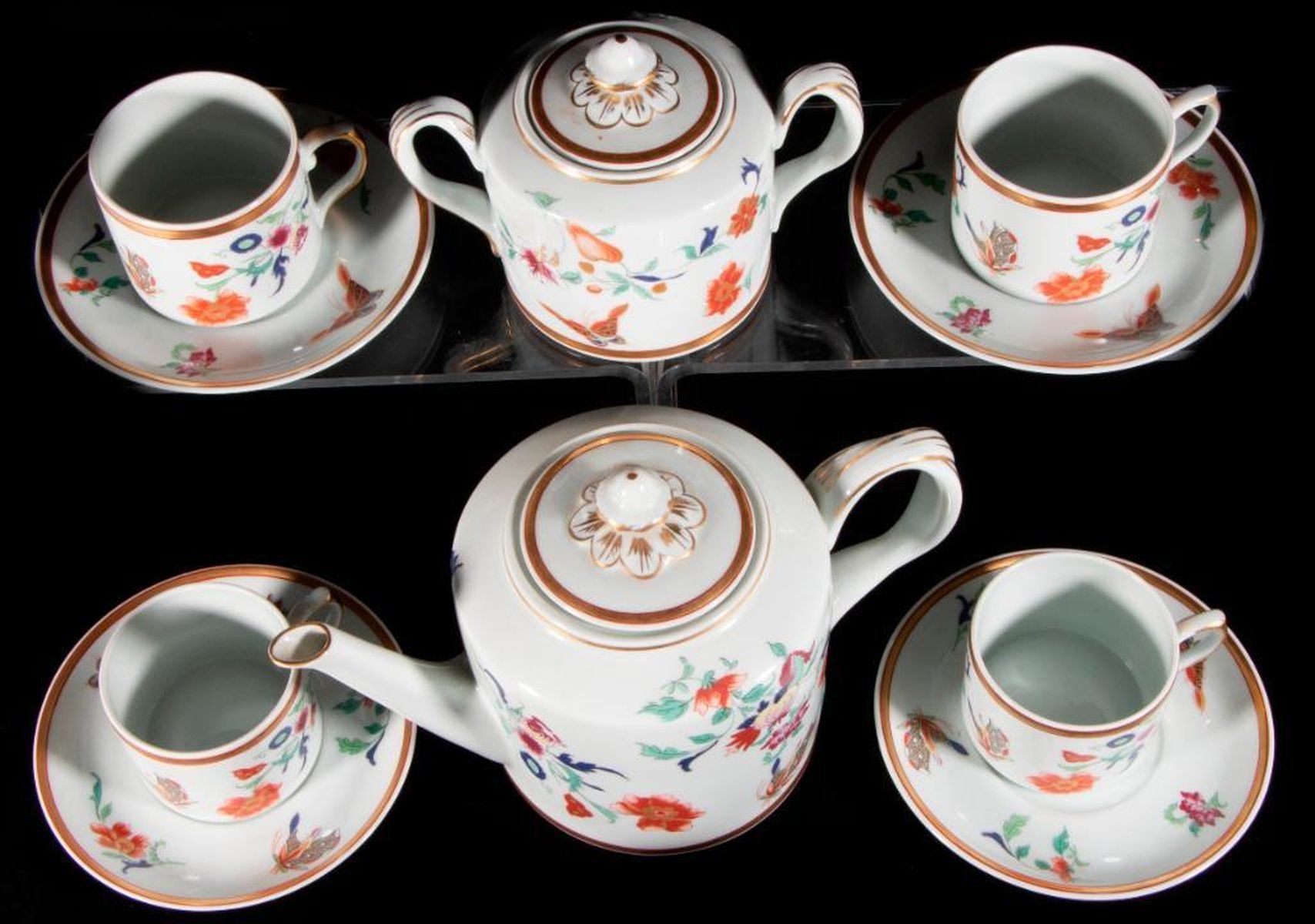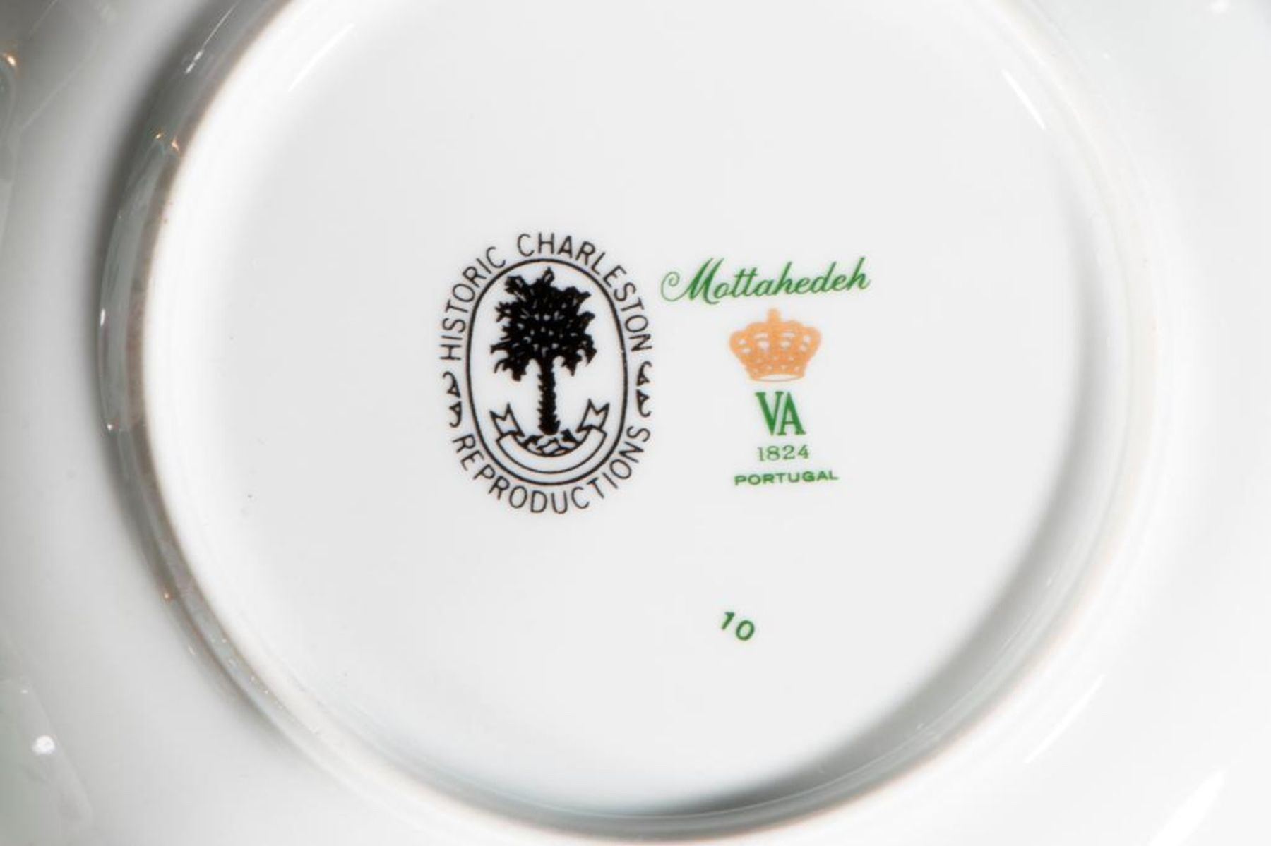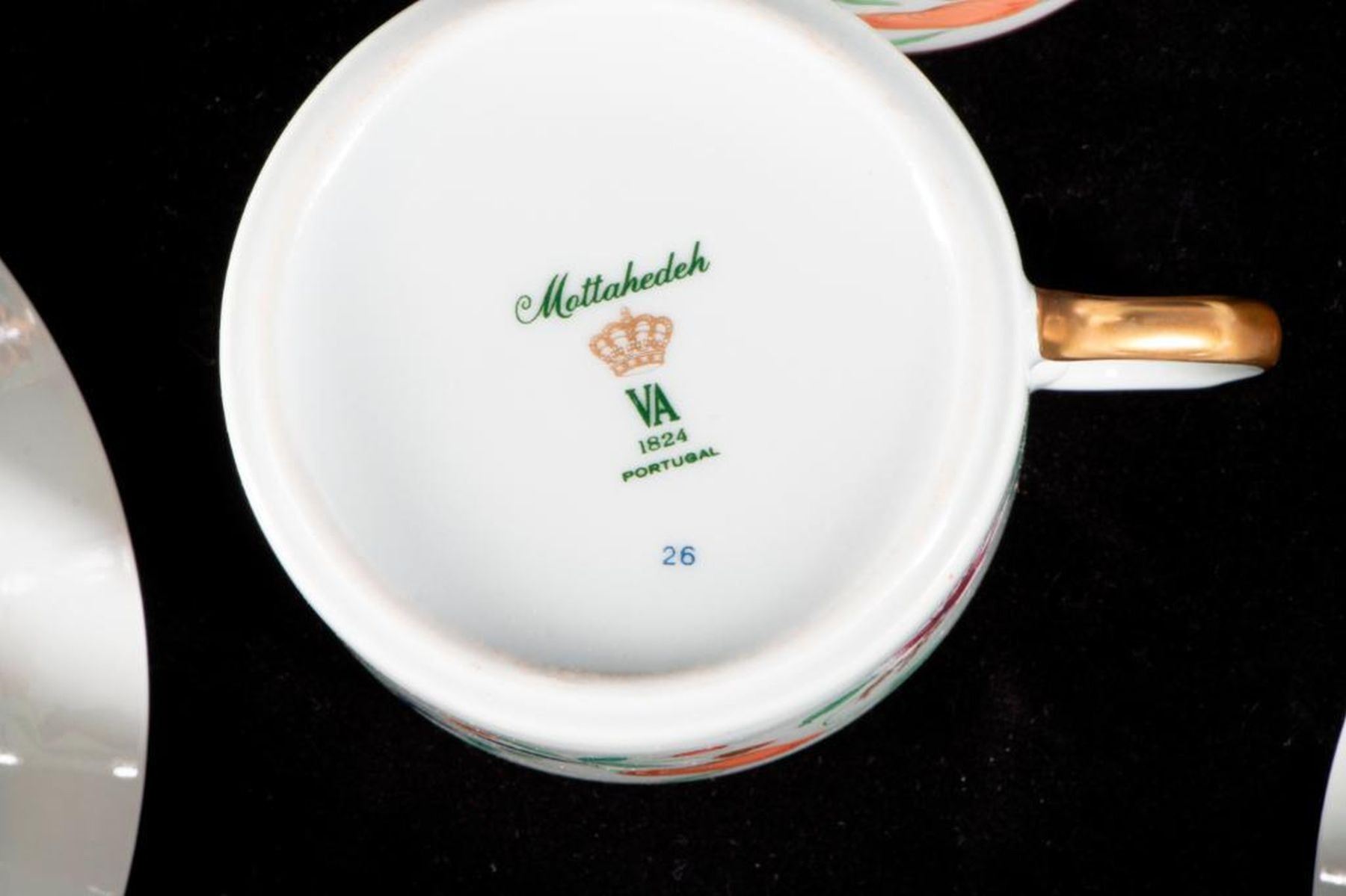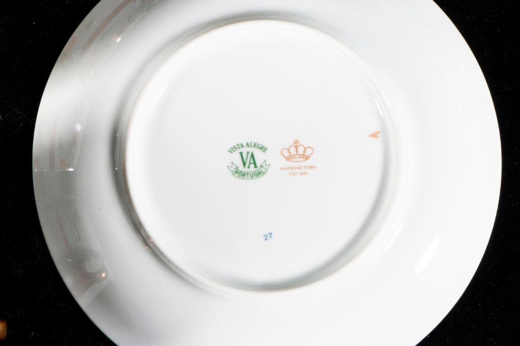 A hand painted porcelain Portuguese Vista Alegre table set consisting of 10 dinner plates (10 1/4 diameter), 12 salad plates, 12 soup bowls,12 tea cups, 14 saucers, 2 butter dishes, 1 gravy and saucer, 1 tureen (9 1/2 inches high x 13 x 9), 1 teapot, 1 sugar, 1 cream, 1 salad bowl, 69 pieces total. Items are sold as is. Please inquire about condition if not otherwise stated.