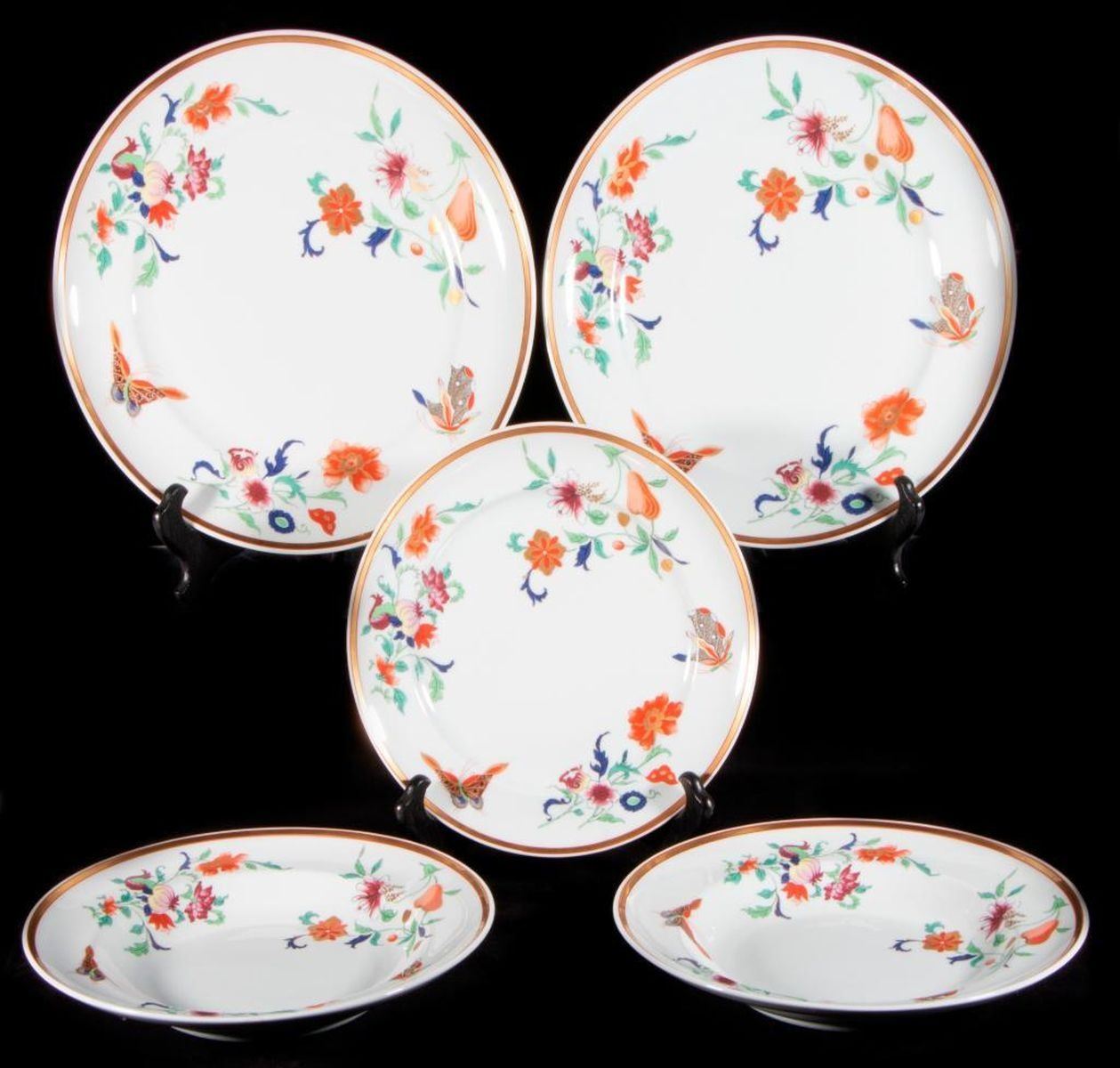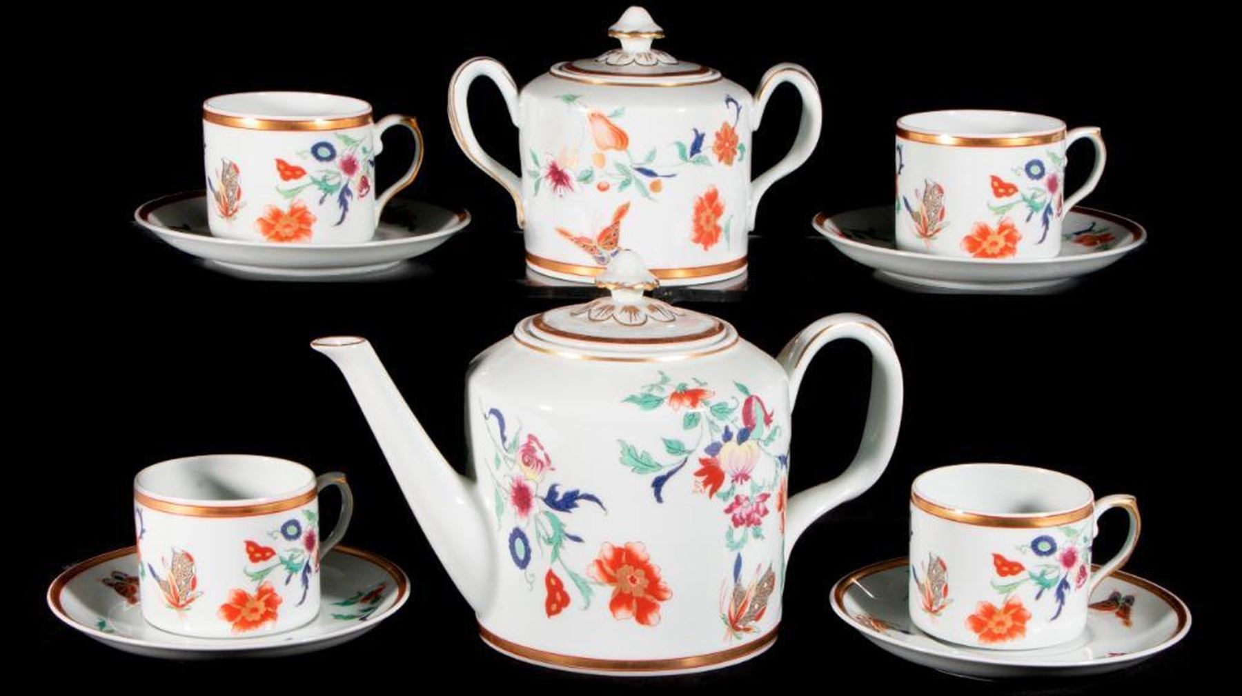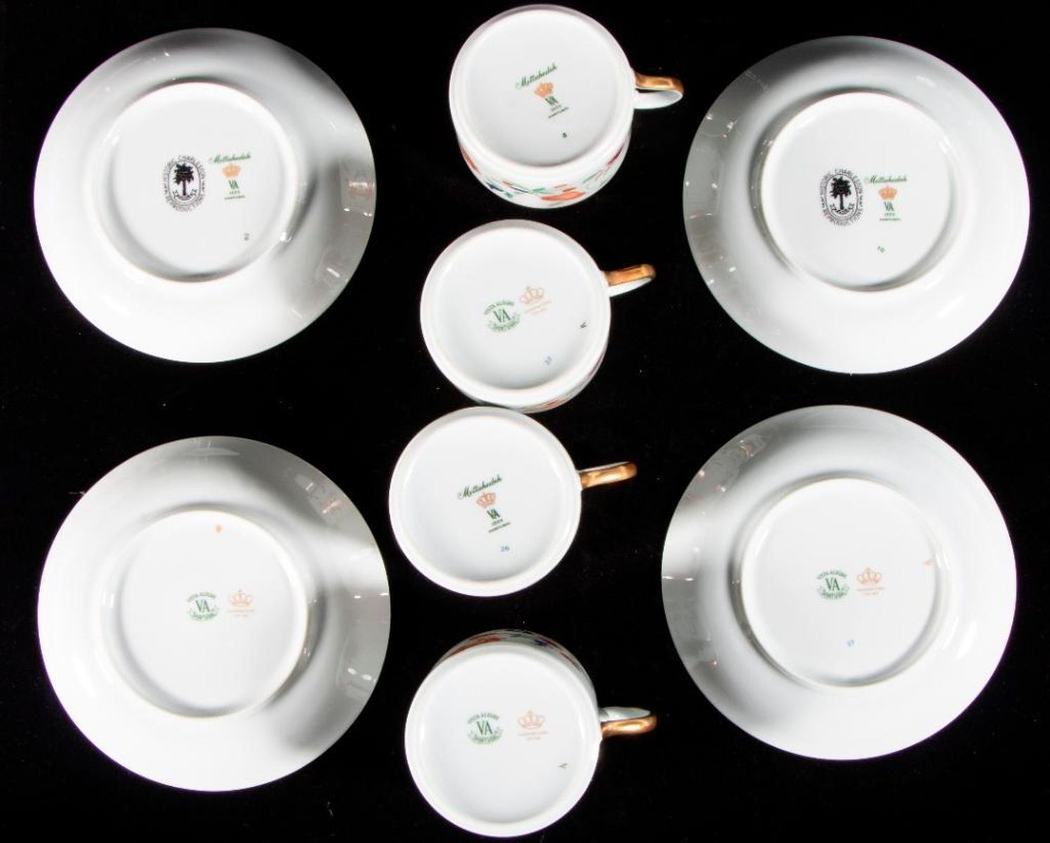 A hand painted porcelain Portuguese Vista Alegre table set consisting of 10 dinner plates (10 1/4 diameter), 12 salad plates, 12 soup bowls,12 tea cups, 14 saucers, 2 butter dishes, 1 gravy and saucer, 1 tureen (9 1/2 inches high x 13 x 9), 1 teapot, 1 sugar, 1 cream, 1 salad bowl, 69 pieces total. Items are sold as is. Please inquire about condition if not otherwise stated.