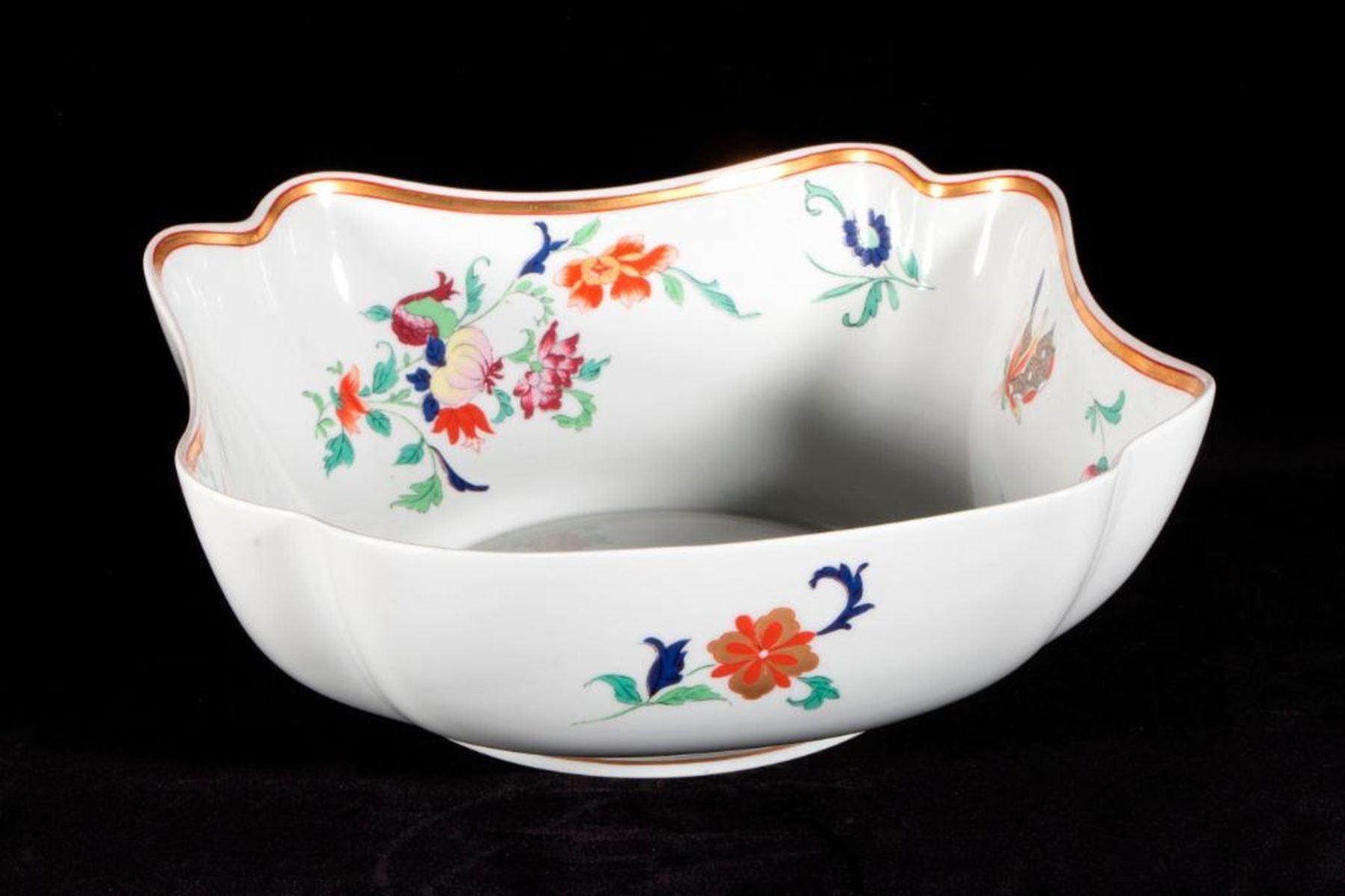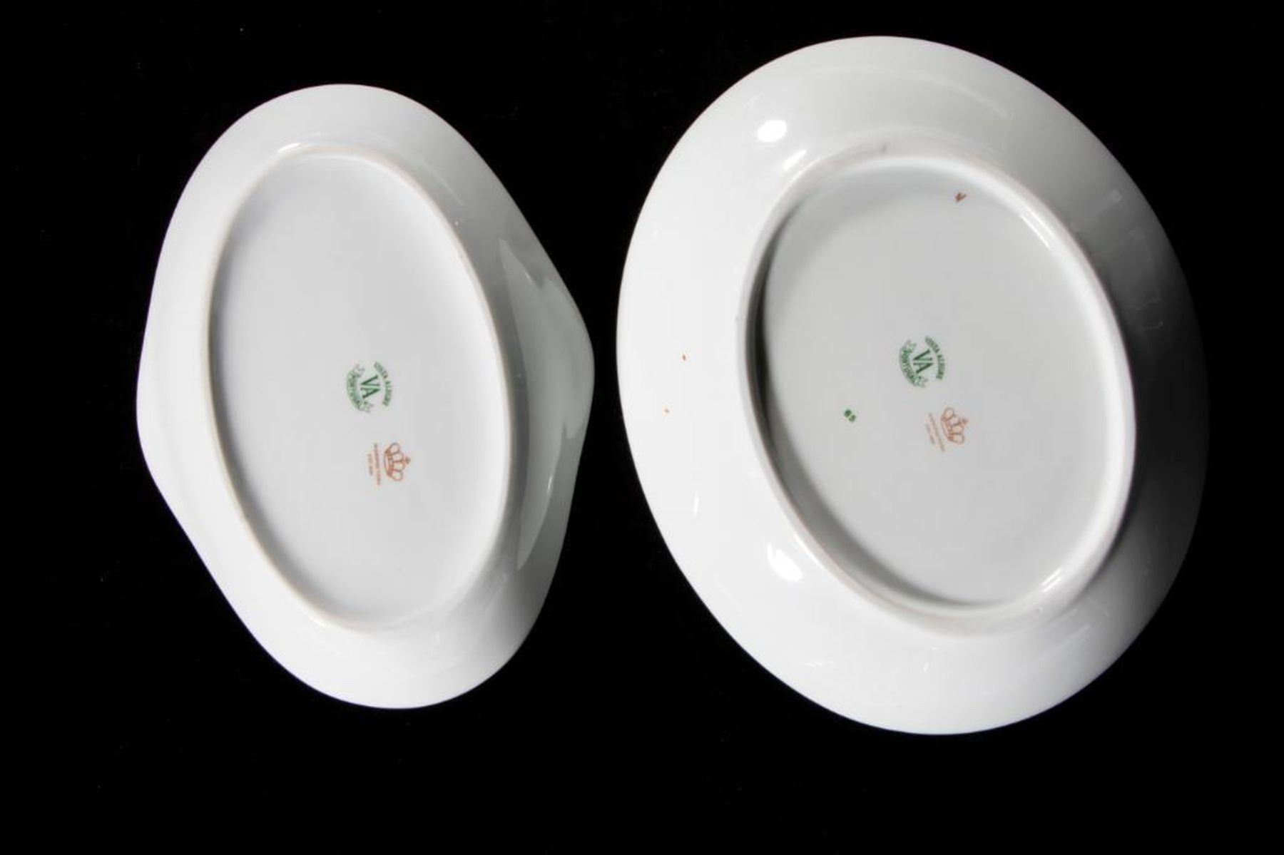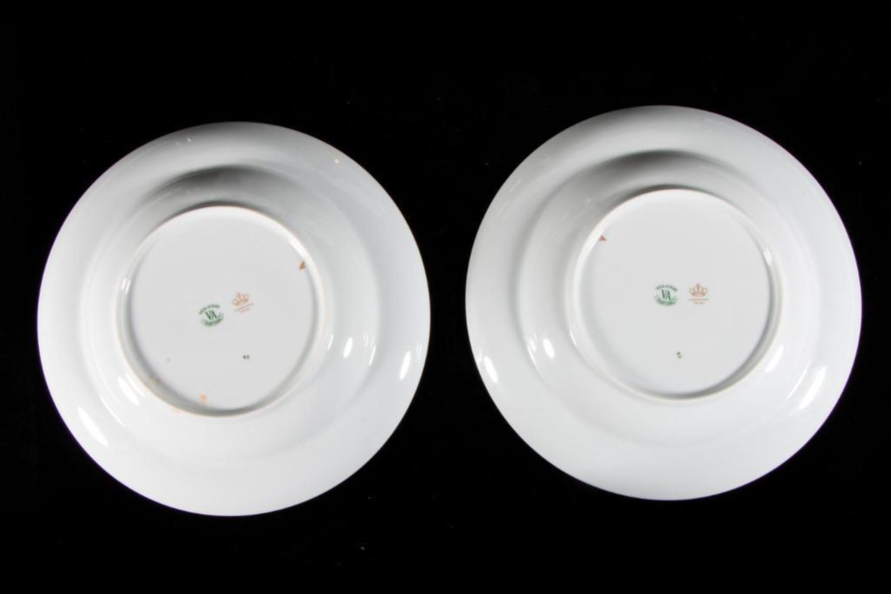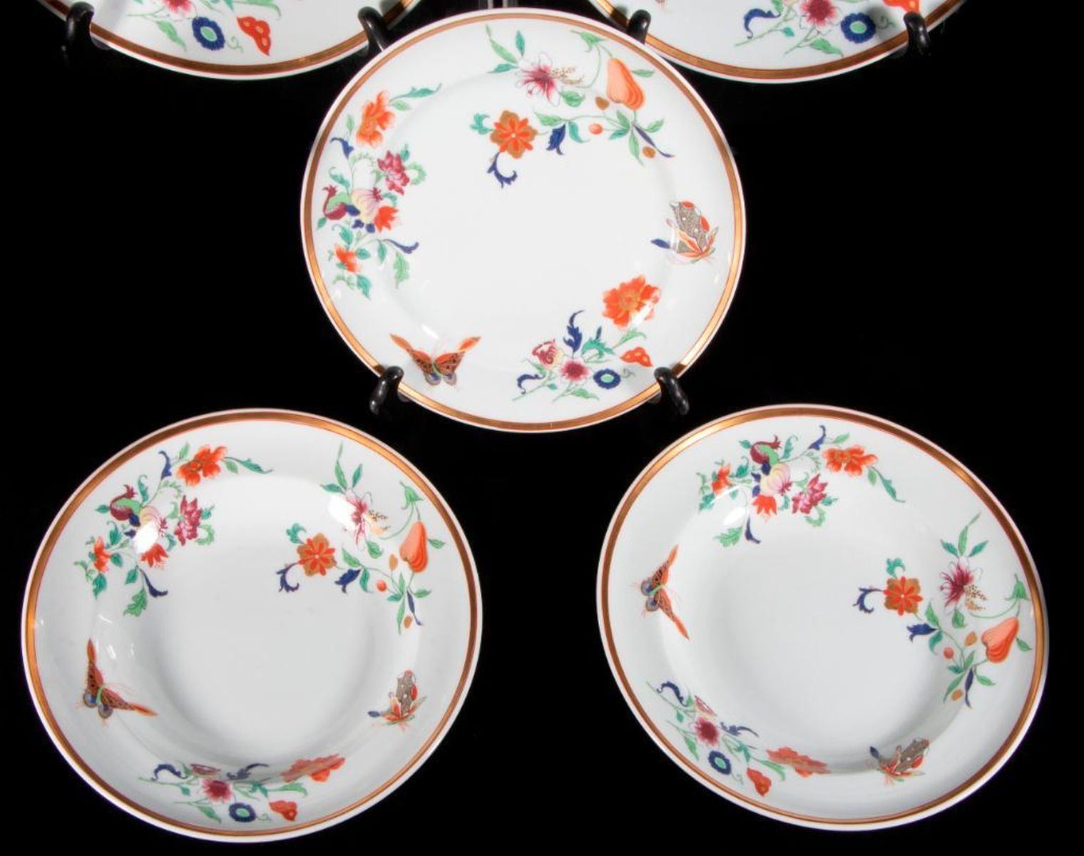 A hand painted porcelain Portuguese Vista Alegre table set consisting of 10 dinner plates (10 1/4 diameter), 12 salad plates, 12 soup bowls,12 tea cups, 14 saucers, 2 butter dishes, 1 gravy and saucer, 1 tureen (9 1/2 inches high x 13 x 9), 1 teapot, 1 sugar, 1 cream, 1 salad bowl, 69 pieces total. Items are sold as is. Please inquire about condition if not otherwise stated.