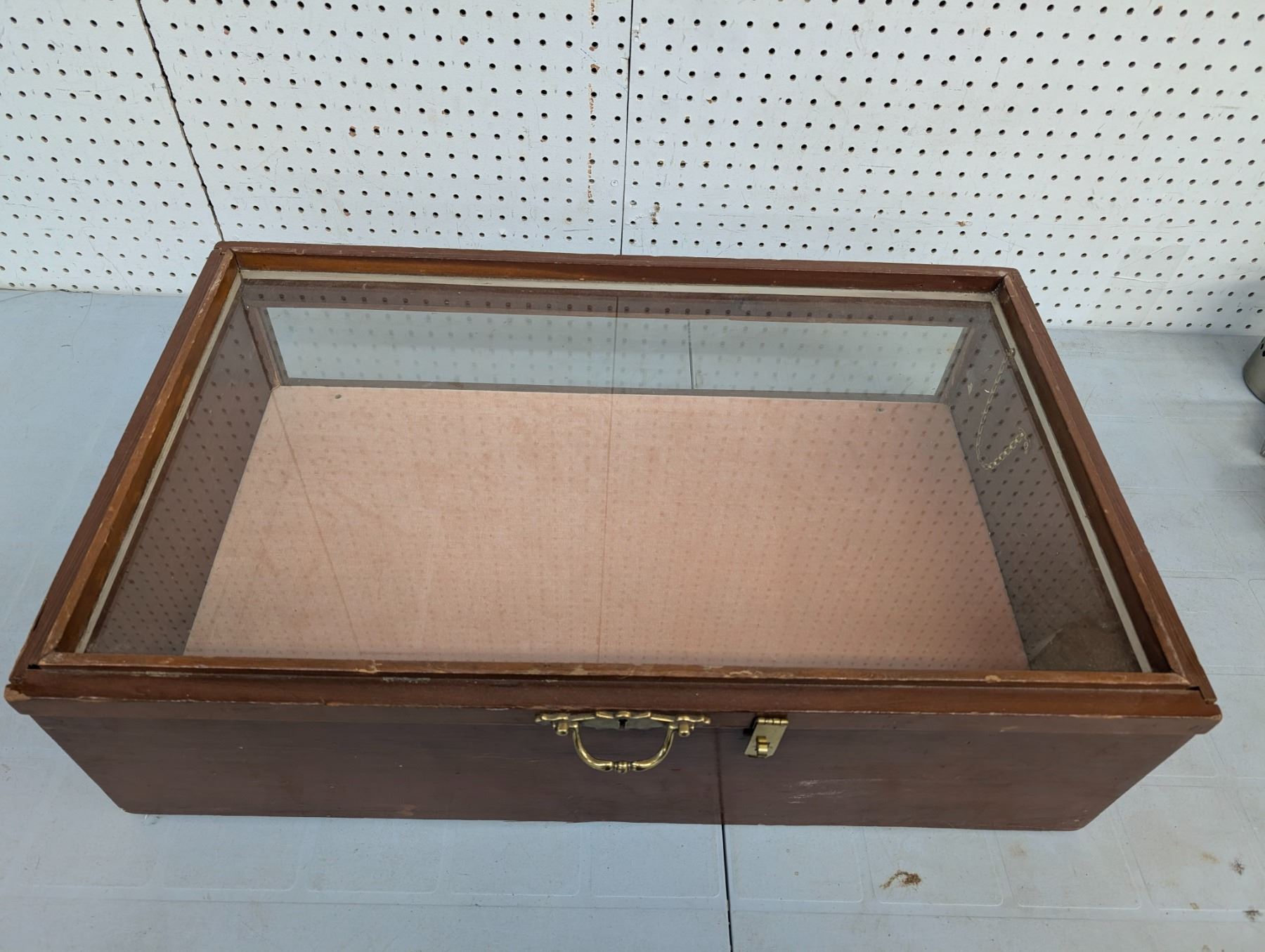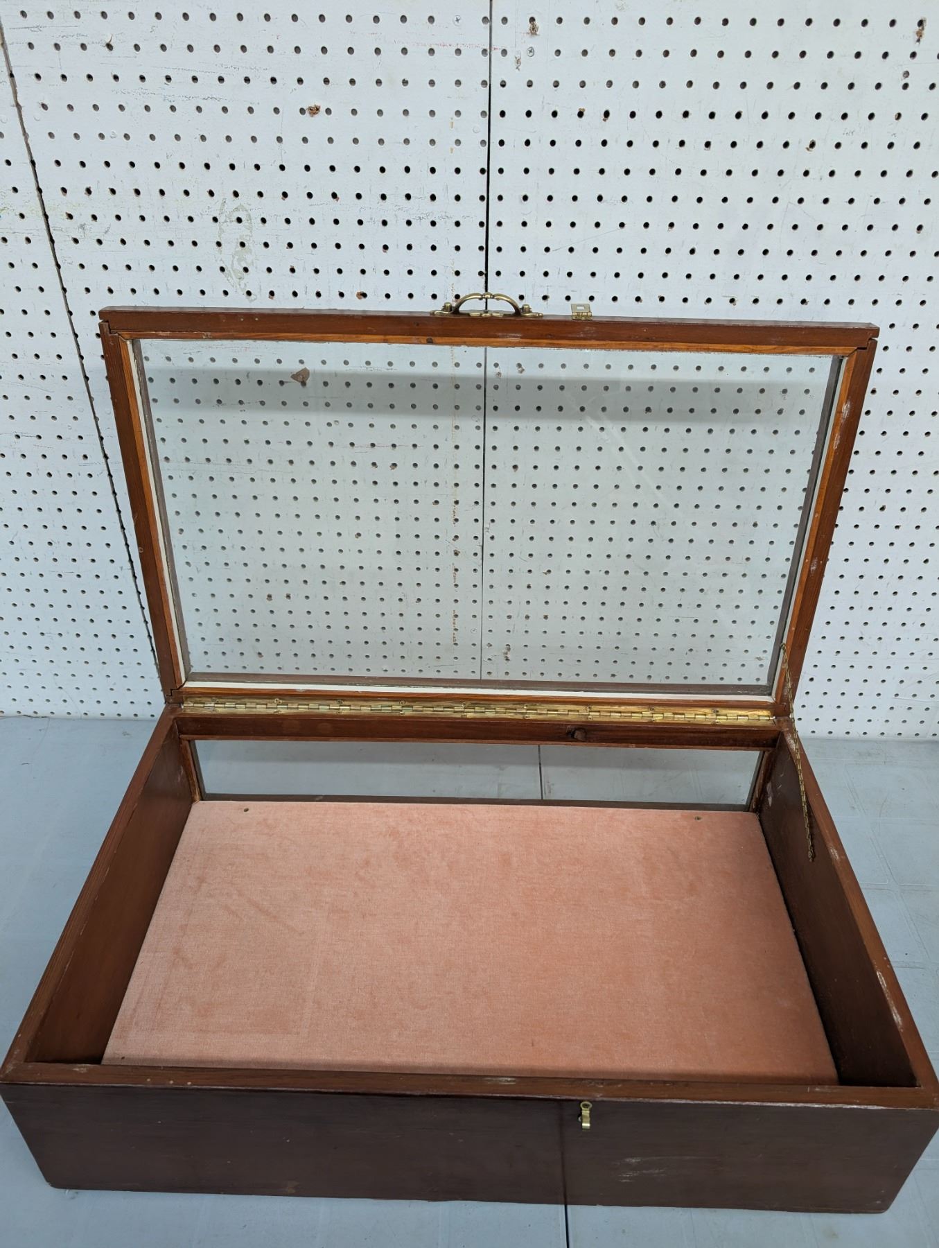 Felt lined, wood and glass case. hinged lid with brass latch.