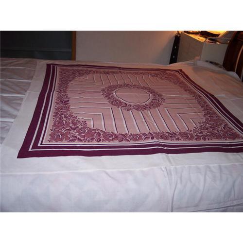 Burgandy,White and Mauve Tablecloth with roses all around the border and center circle of roses.Great colors.No holes or stains.Measures 43 1/2x53.