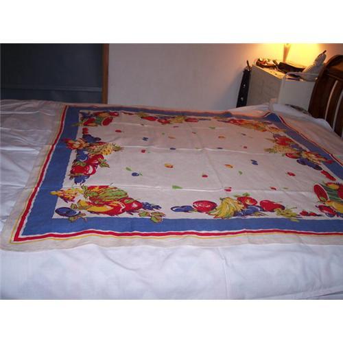 Great vintage 1950s Fruit tablecloth.Linen texture to this.No holes or stains.Fruit around border with fruit sprinkled across center.Great colors.Measures 52x51