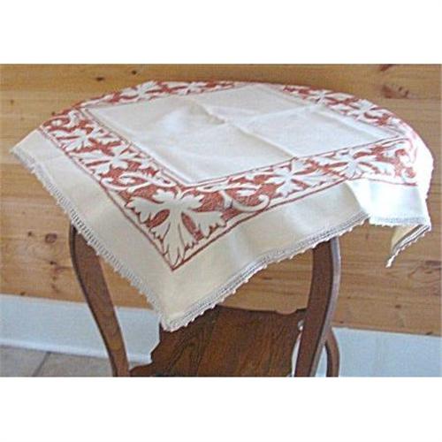 Tablecloth with amazing rust cross stitch on tan which I believe is heavy linen. Not exactly leaves but perfect for Fall table. Feathers design or something. <BR>This hand stitchery took zillions of hours I am sure. <BR>The edging is handcrocheted as well. The tablecloth is in mint condition and is 29.0 square or so. Coloring is darker than photos on this Autumn beauty. Dark tan or Ecru? <BR>Beautiful vintage craftmanship on this tea size or topper tablecloth.