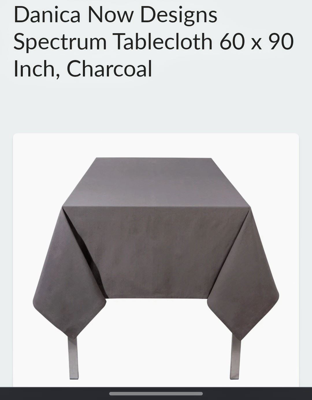 Elegant charcoal tablecloth, 60 x 90 inches, spill-resistant and machine washable, new.