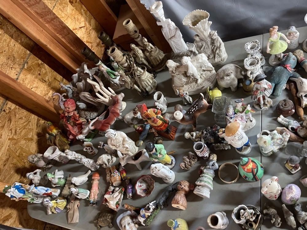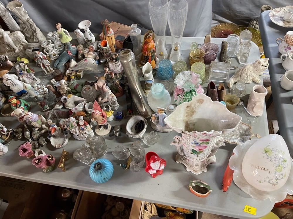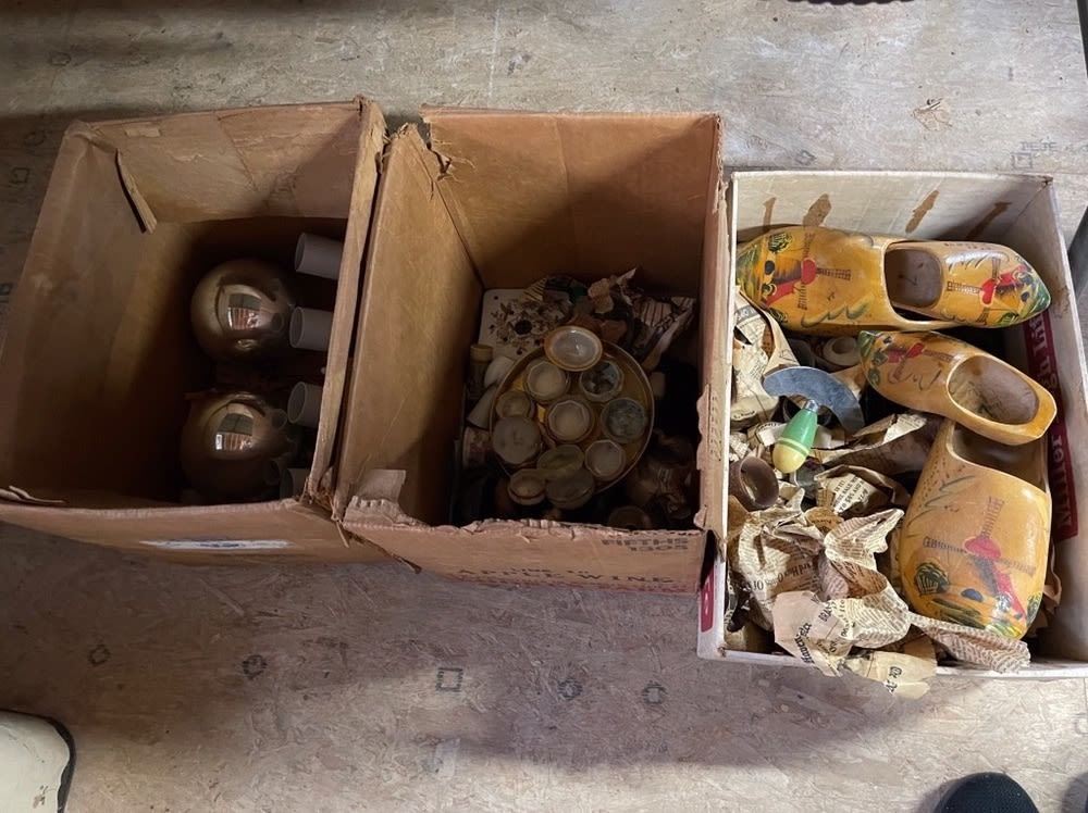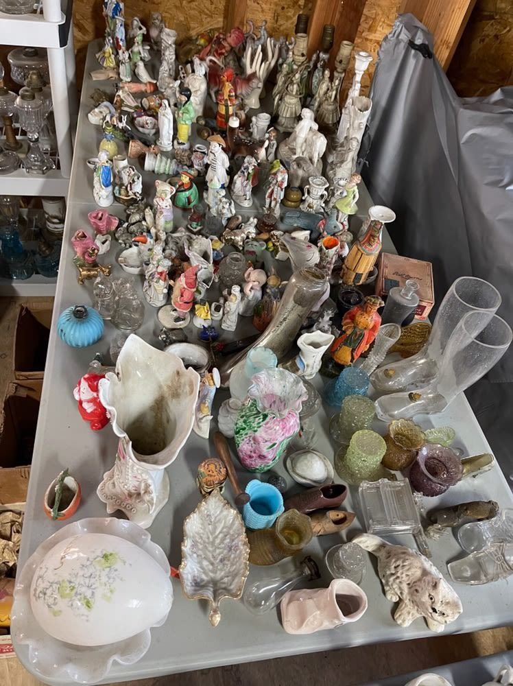 All contents of table and 3 boxes including porcelain figurines, miniatures, colored glass, additional boxes with wooden clogs, additional porcelain, etc. all from the attic being sold for one monies!
