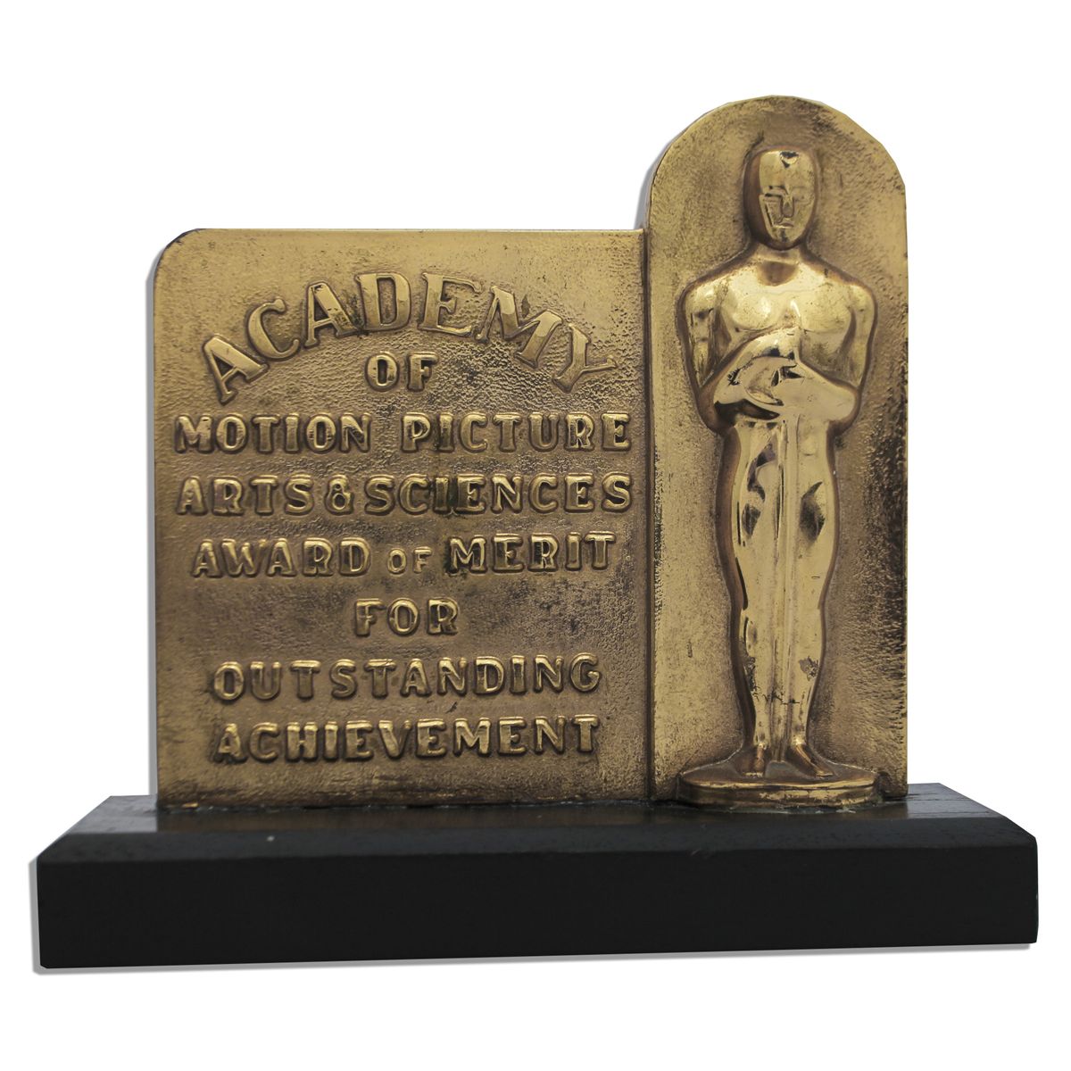 Tablet style ''Award of Merit for Outstanding Achievement'' presented by the Academy of Motion Picture Arts and Sciences. Gold-plated britannium tablet features the Oscar figure standing on the round film reel in relief. Beside it, ''ACADEMY'' is spelled in lettering arranged arcing over the rest of the label: ''Of Motion Picture / Arts & Sciences / Award Of Merit / For / Outstanding / Achievement''. Over the course of the Academy Awards, several award categories, such as Best Supporting Actor and Actress, were given the tablet awards and then later, the Oscar statue. The earlier recipients of the tablet award could exchange theirs for the Oscar award, and then the Academy would remove the identifying plaque on the original. Though it's not known who this original award belonged to, it likely originated from the cadre of awards that were later exchanged for figural Oscar statues. Tablet measures 5.5'' across and 5.25'' in height at its tallest, and is mounted to a black wooden base measuring 6.75'' across and 2.5'' deep, bringing the overall measurement to 6.75'' across, 6.25'' tall, and 2.5'' deep. Weighs 2 pounds, 15 ounces. Dent to Oscar's forehead and glue to the bottom of the metal tablet, which would have originally been mounted to a black marble base, else near fine condition.