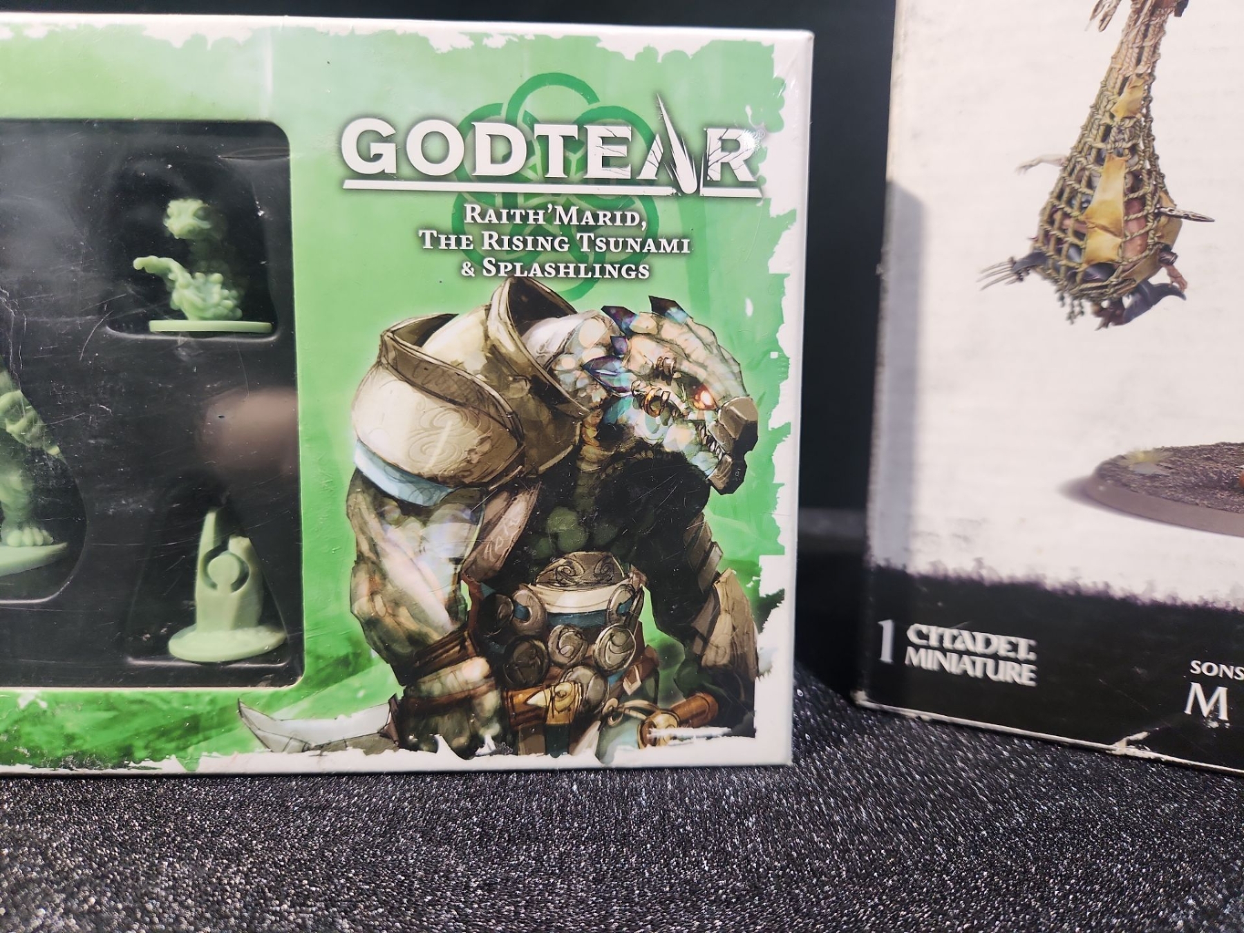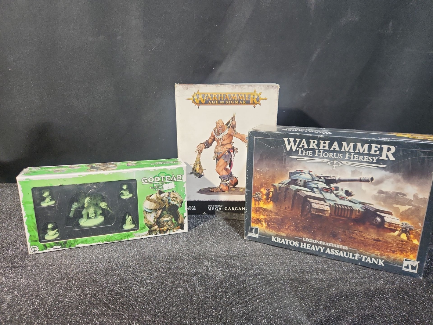 This lot includes three brand-new Warhammer & Godtear models and kit sets. Contains a fully paintable Kratos Assault Tank from the Horus Heresy Warhammer series, an untouched Mega-Gargant plastic build kit from the Age of Sigmar Warhammer series ready for you to construct, and the Raith'Marid Champion Expansion for Godtear, pre-assembled and ready to play.