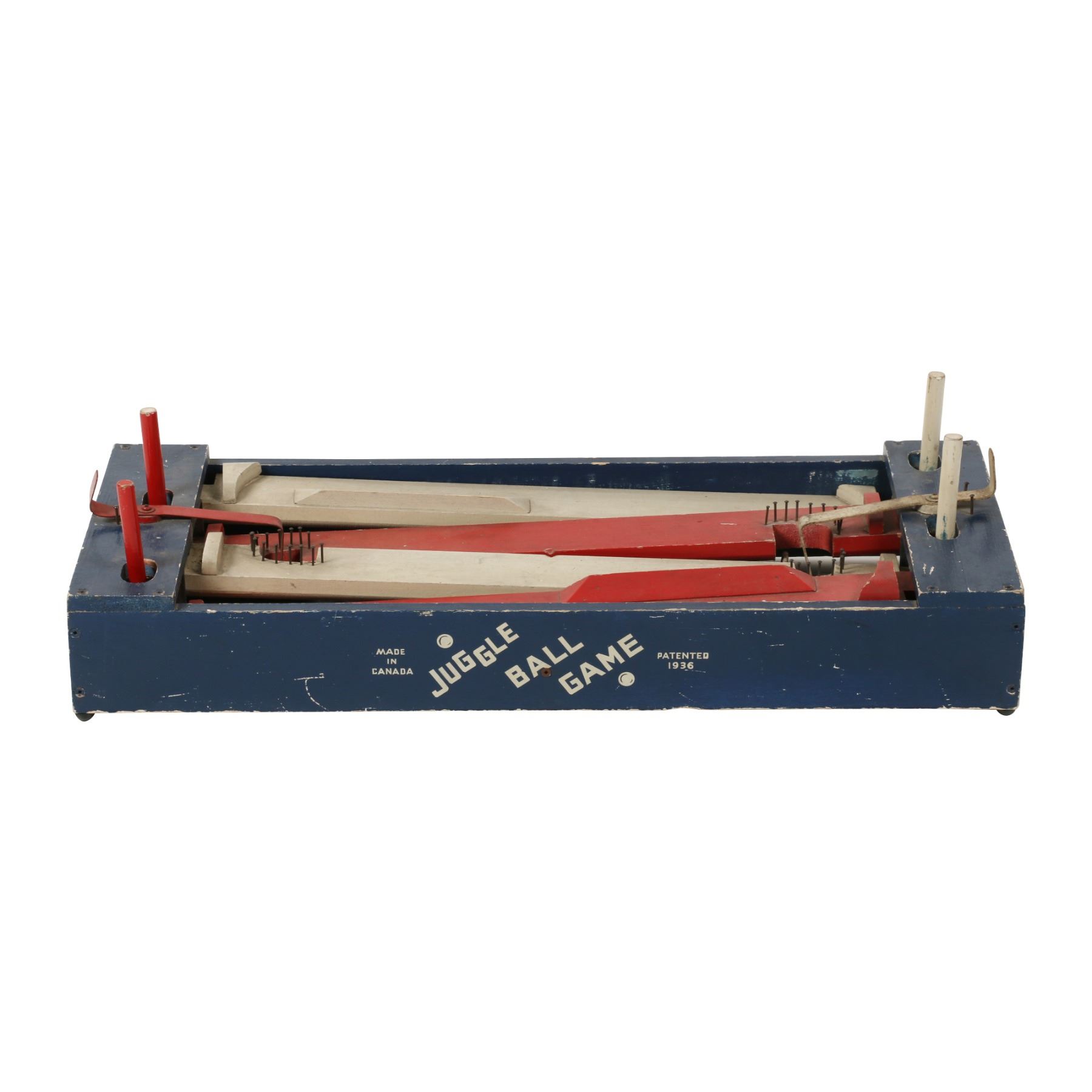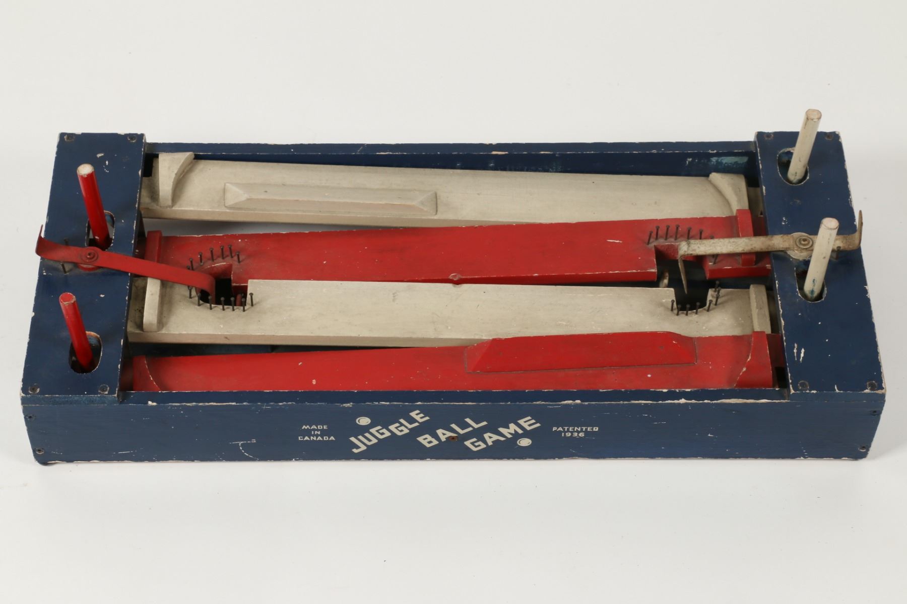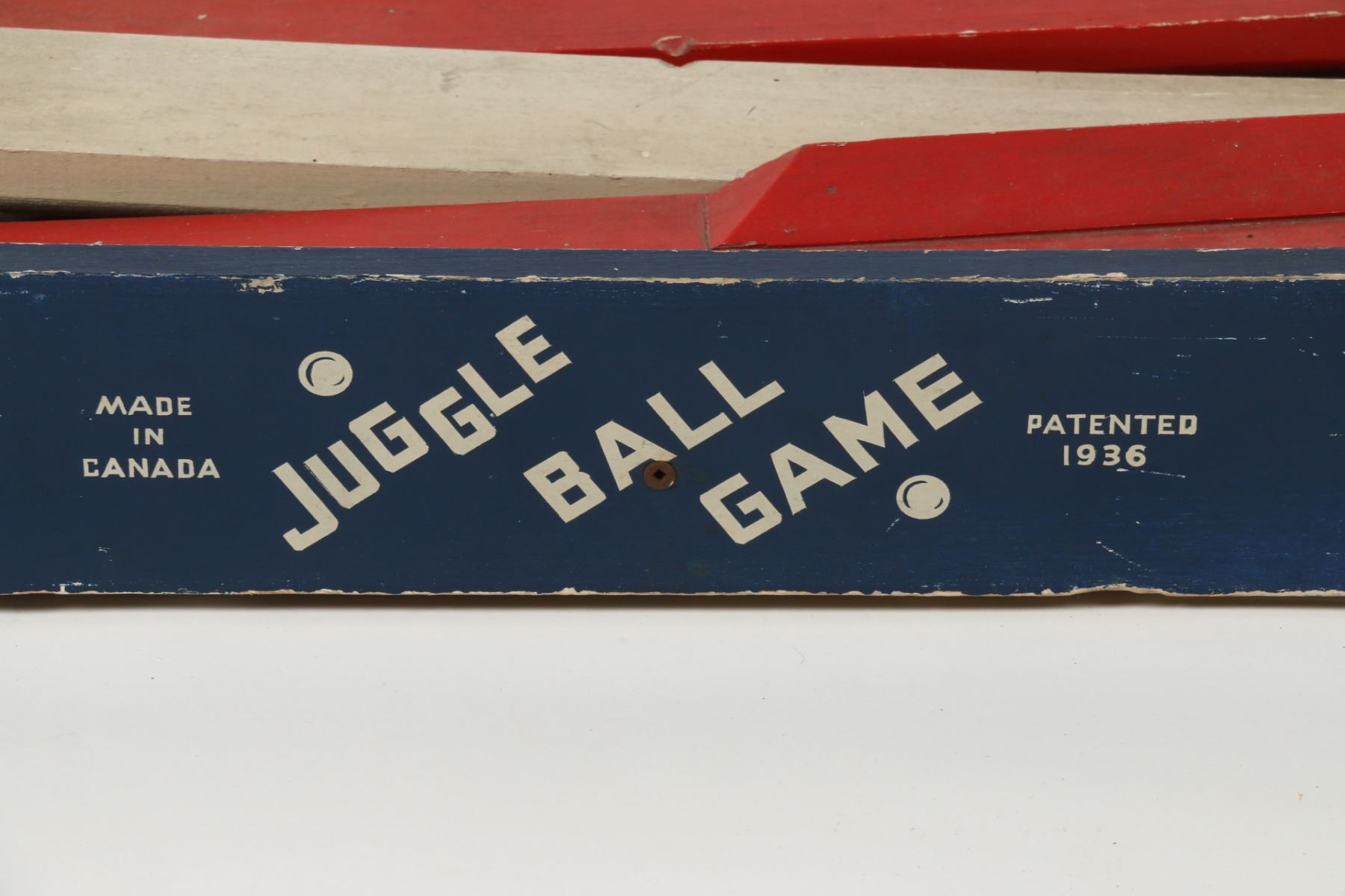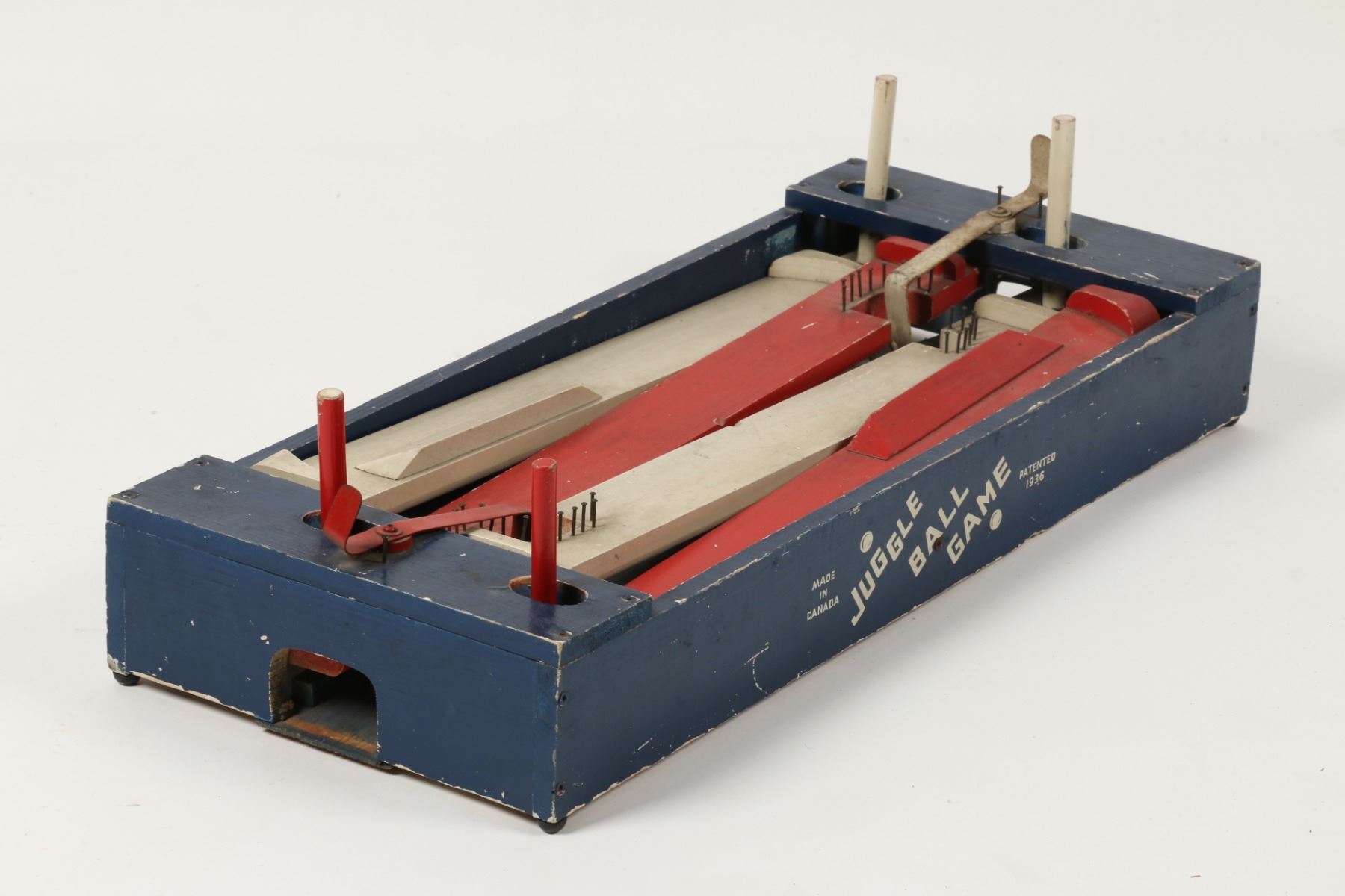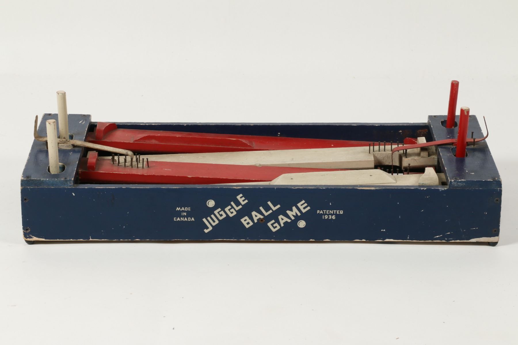Canadian. Circa 1936. Marked, "Made in Canada - Juggle Ball Game - Patented 1936", outer panels. A two-player game where each opponent defends their goal while attempting to score. Painted wood construction. 26.5" x 12" x 3.5". Minor surface scuffs and scratches. $100-150. Complete and functioning. Ball not included.
