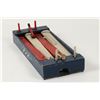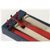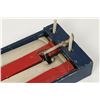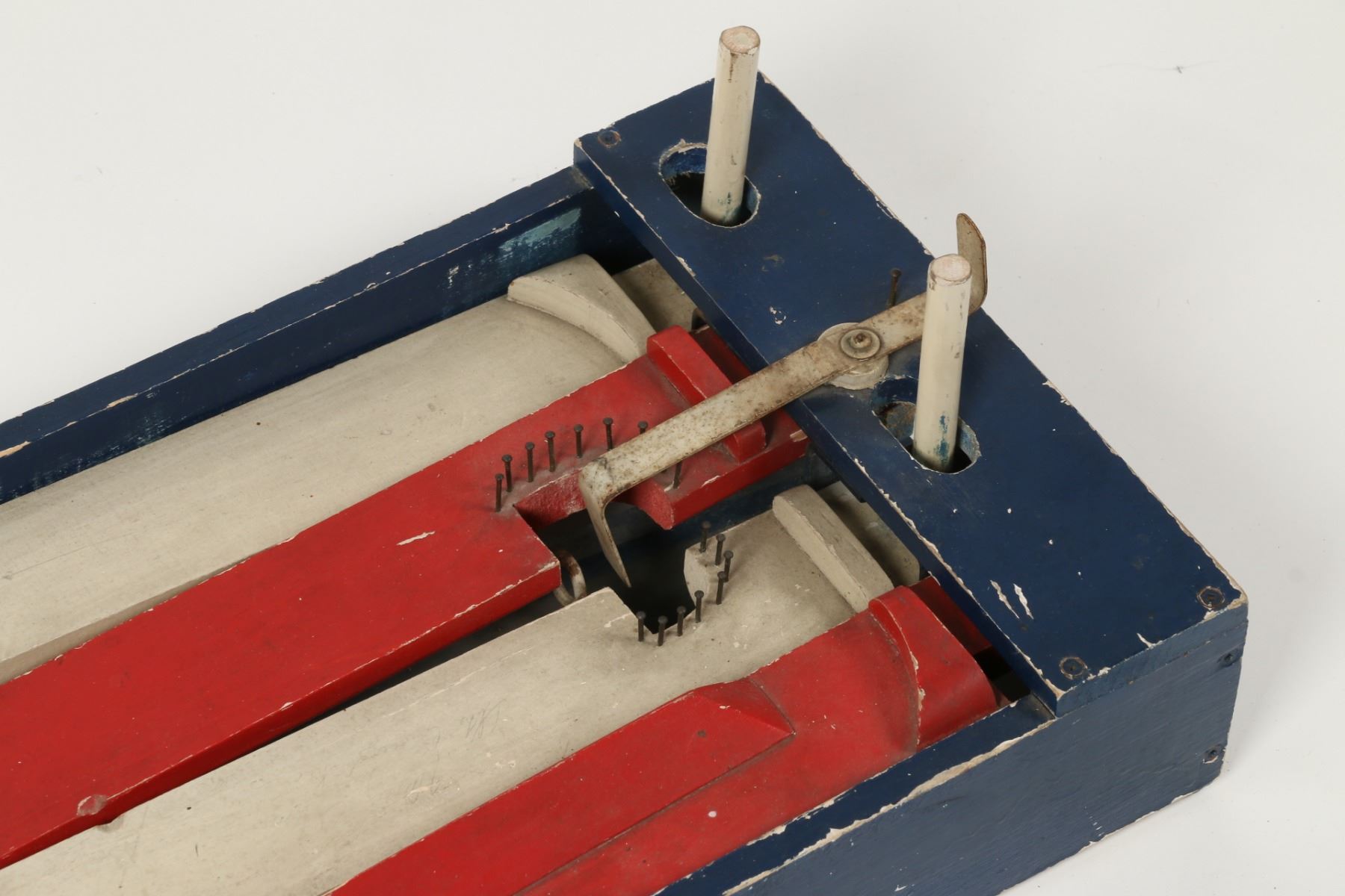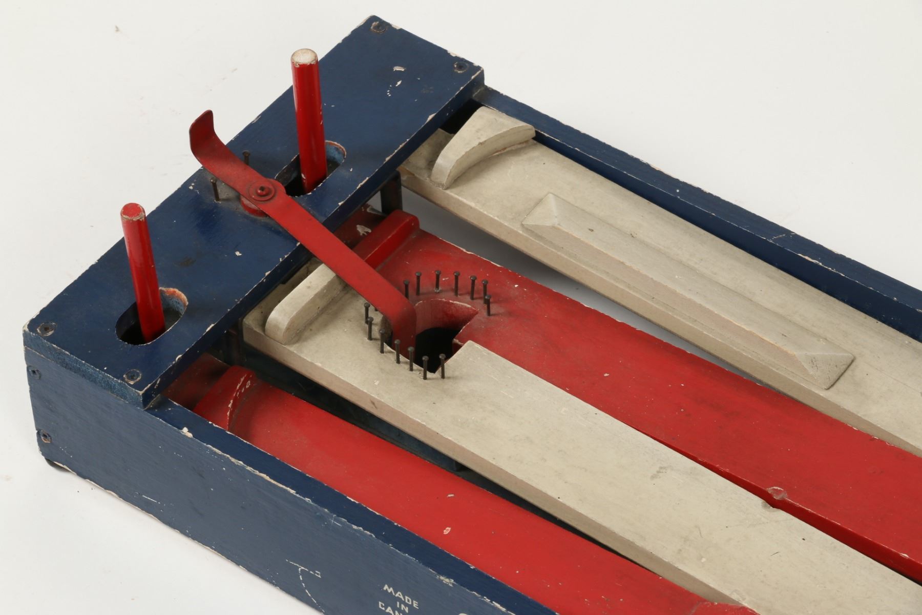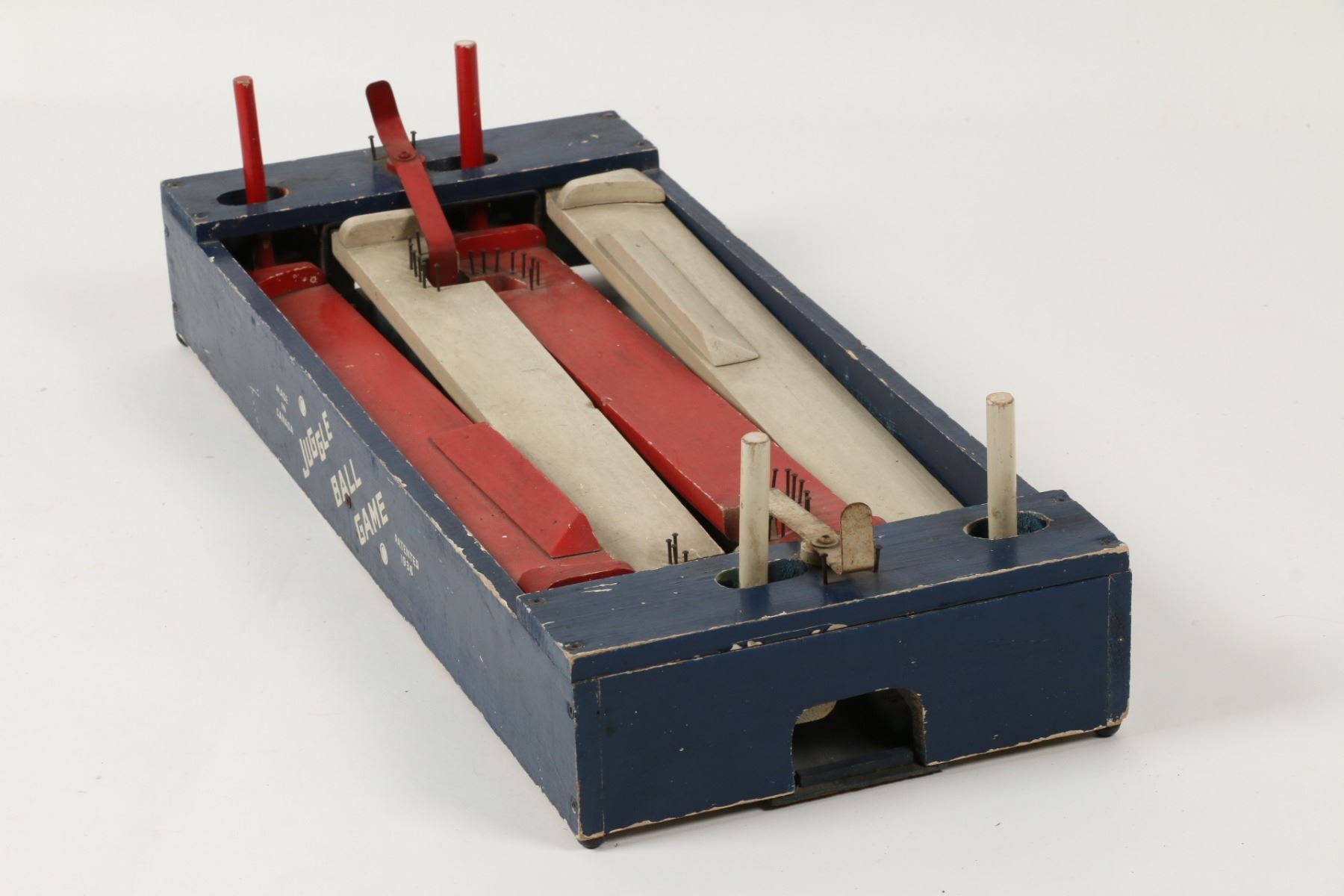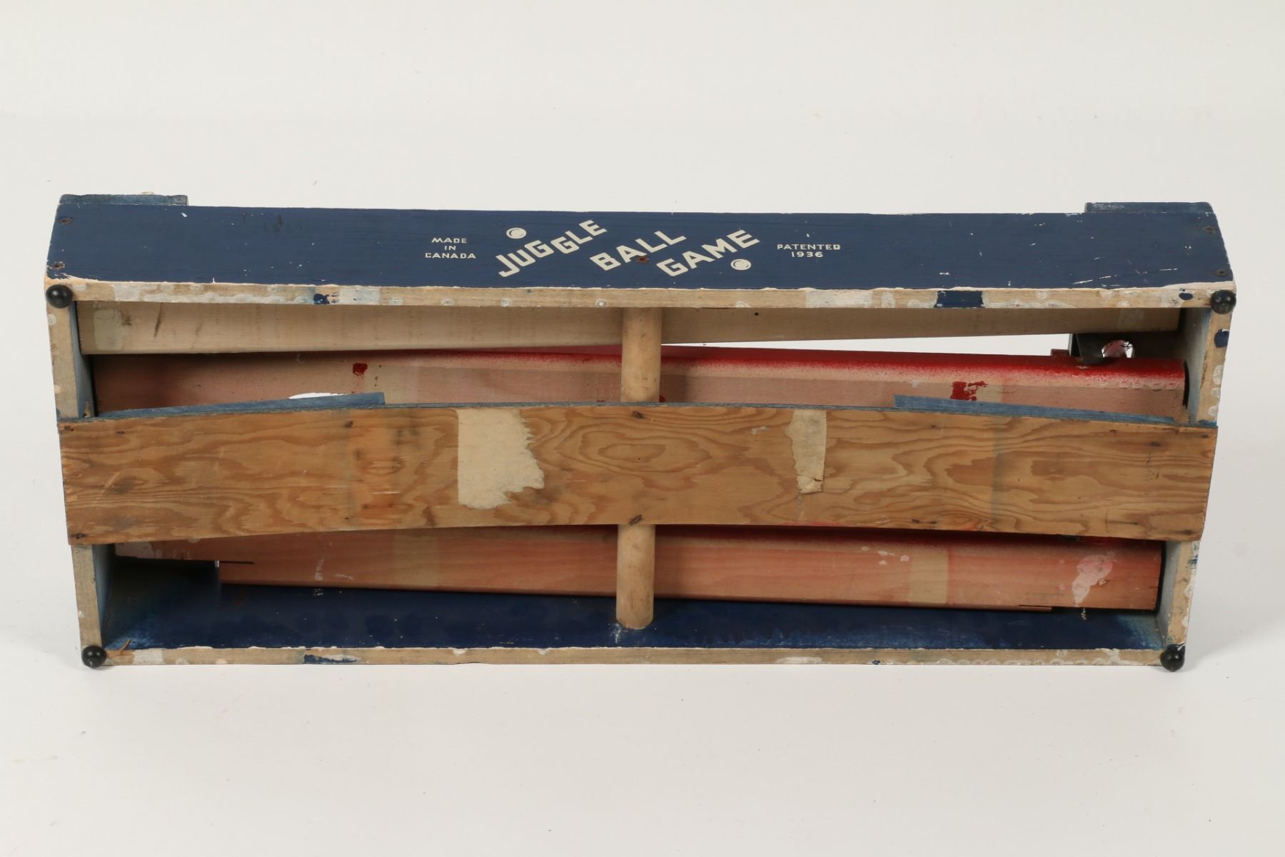 Canadian. Circa 1936. Marked, "Made in Canada - Juggle Ball Game - Patented 1936", outer panels. A two-player game where each opponent defends their goal while attempting to score. Painted wood construction. 26.5" x 12" x 3.5". Minor surface scuffs and scratches. $100-150. Complete and functioning. Ball not included.