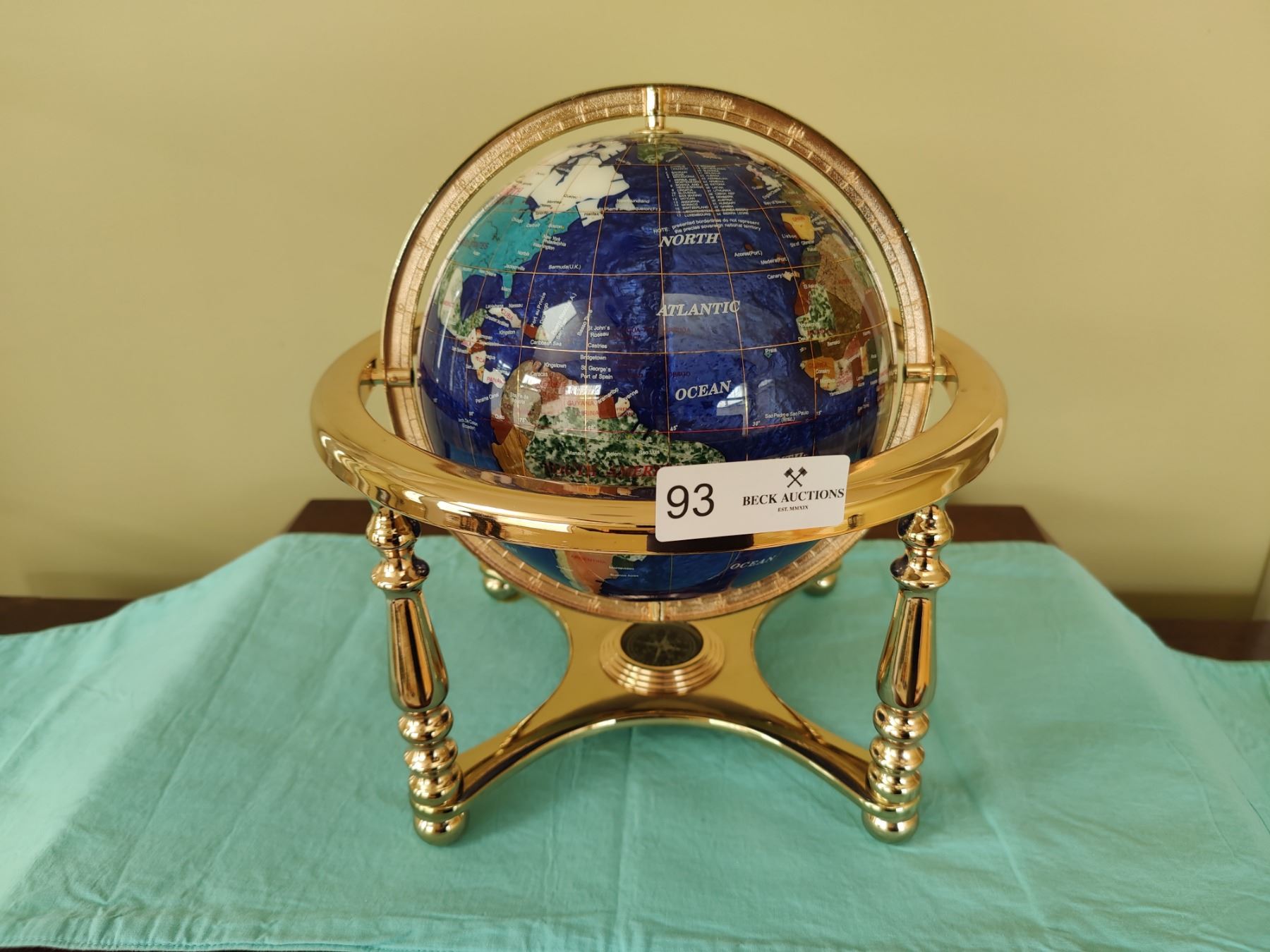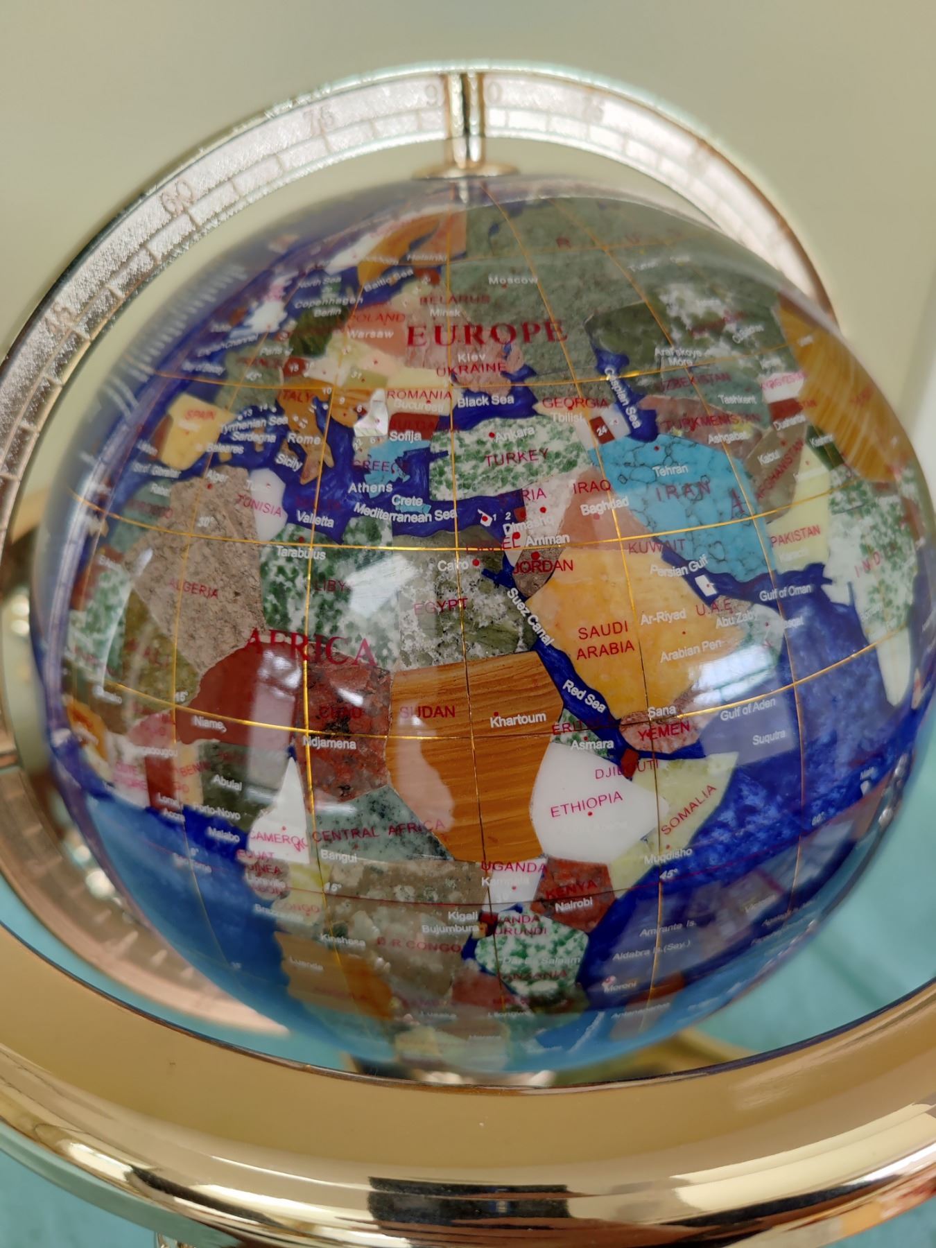 Beautiful globe made of inlayed stones. Excellent condition.