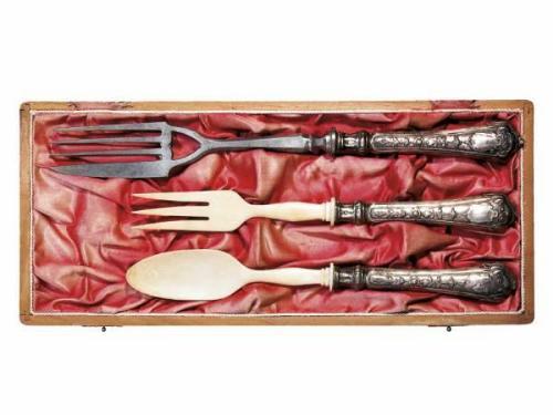 Two pronged fork, 2 pieces of salad servers, engraved silver terminals, original wooden box with silk lining. Marked: Austrian, circa 1880, Josef Szombathy. Neuwirth: II/244.