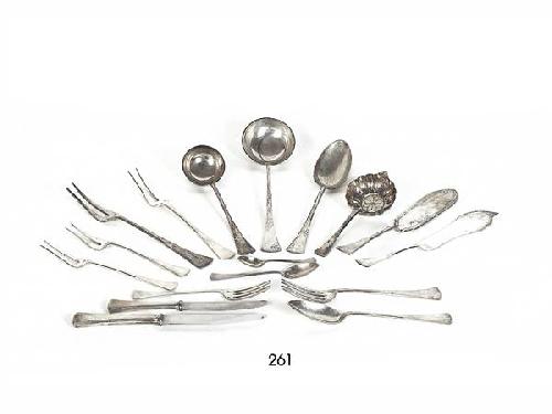 Silver, cut English terminal, 12-12 pieces of table spoons, table forks, middle forks, tea spoons, coffee spoons, table knives, middle knives with rustproof blades, 2-2 pieces of two pronged forks, ham forks, 1-1 piece of soup ladle, milk ladle, sauce ladle, cake server, cake knife, tea strainer, measurable silver weight: 3981.0 g, silver terminals cca. 600.0 g, they are similar but not from the same set, in good condition.