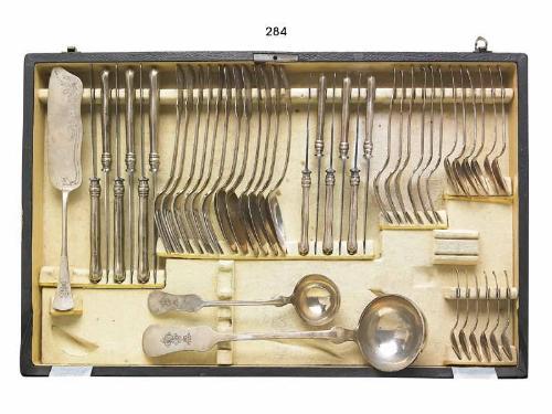 Silver, fiddle form handle, E. I. initials with crown, 6-6 coffee spoons, tea spoons, soup spoons, forks, table knives, forks and knives for starters, 1-1 soup ladle, milk ladle, cake server, fluted English terminals, knives with stainless steel blades, g