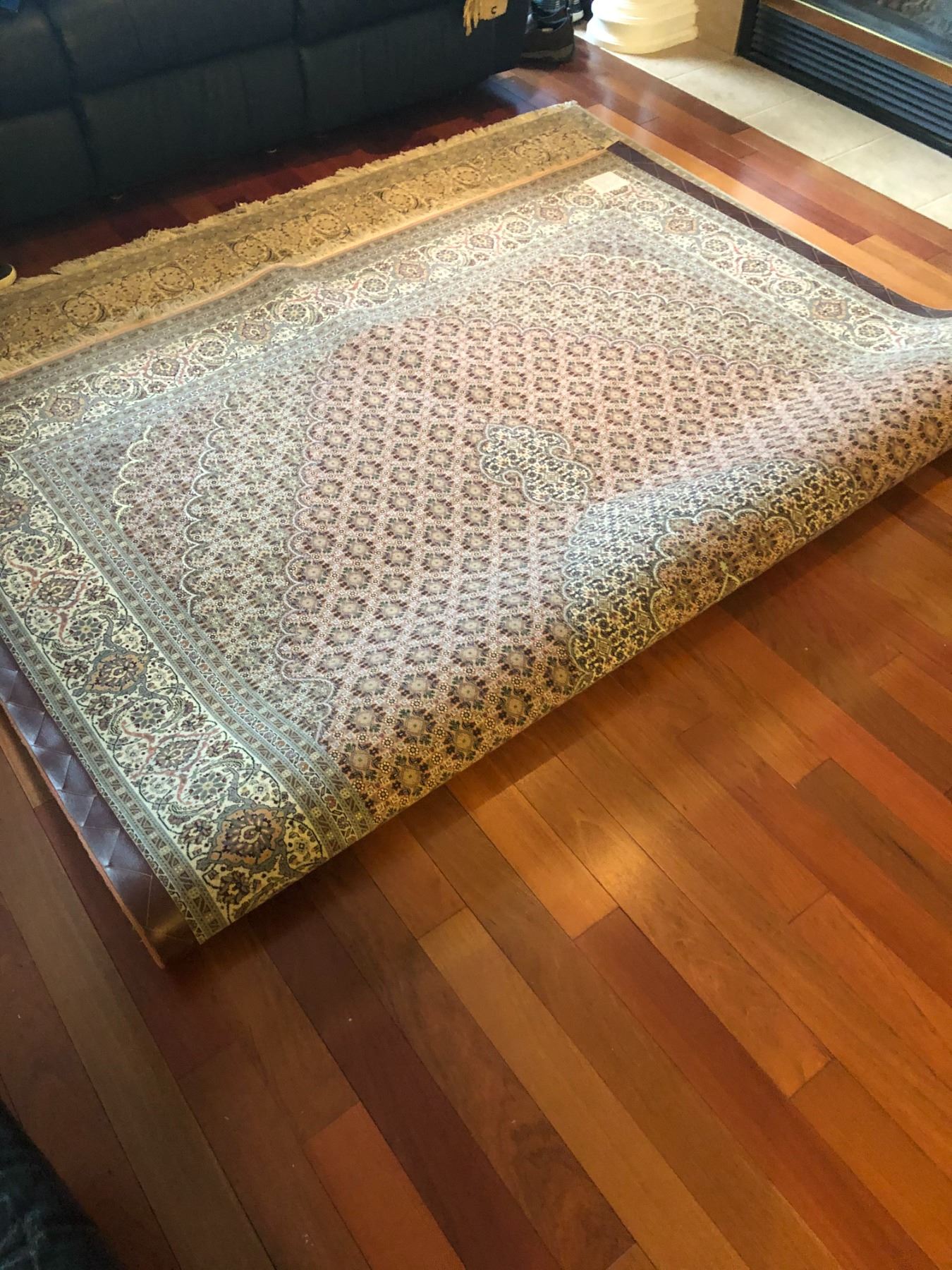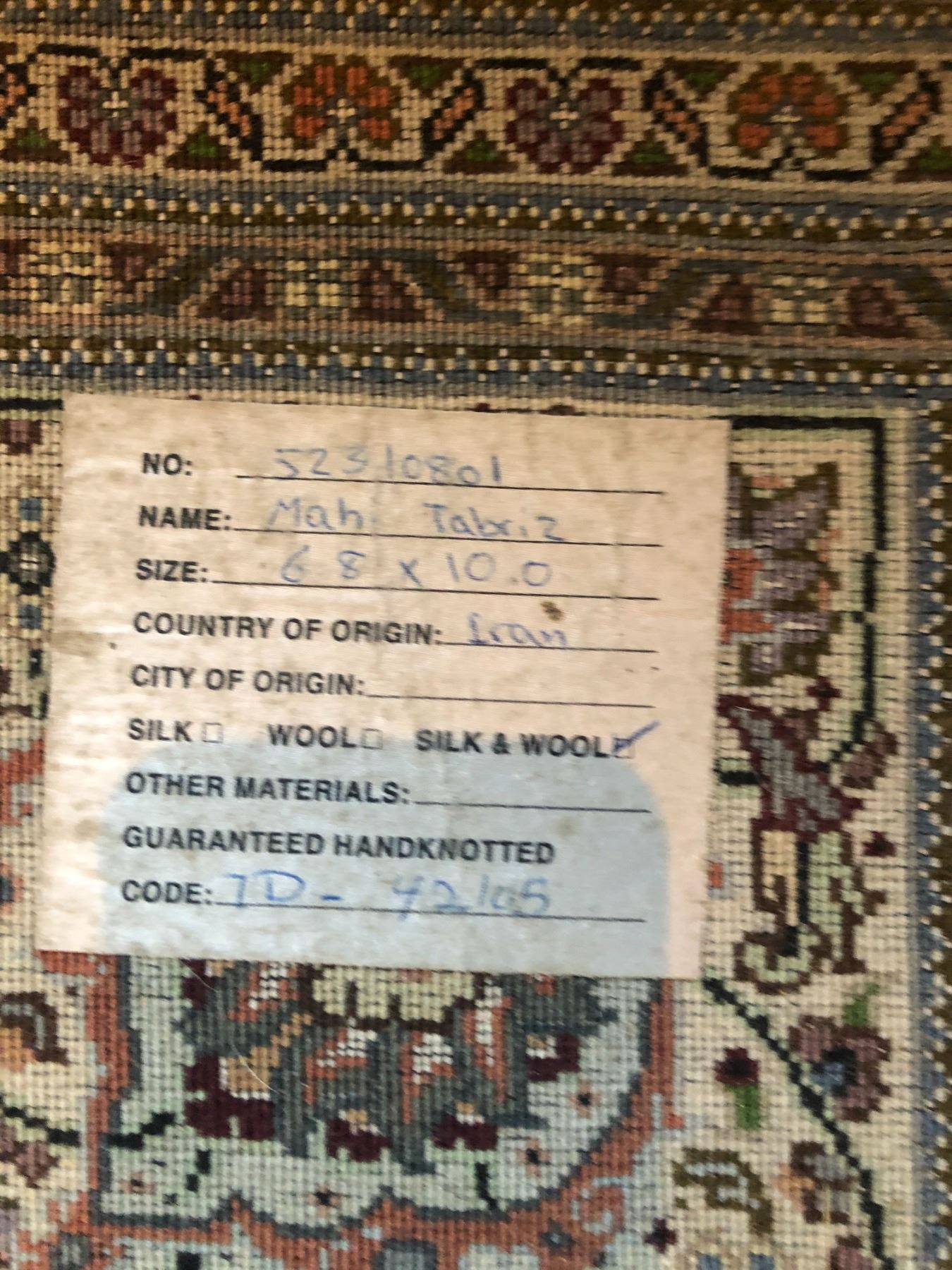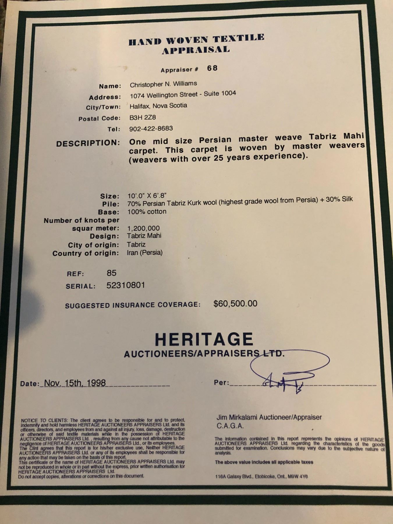One mid size Persian master weave Tabriz Mahi carpet. This carpet is woven by master weavers (weavers with over 25 years experience). 10' X 6'8" Square meter 1,200,000. 70% Persian Tabriz Kirk Wool (higheest grade wool from Persia) + 30% Silk. City of Origin Tabriz County of Origin Iran (Persia). Suggested insurance appraisal $60,500.00 appraised by Heritage Auctioneers/Appraisers Ltd. in 1998