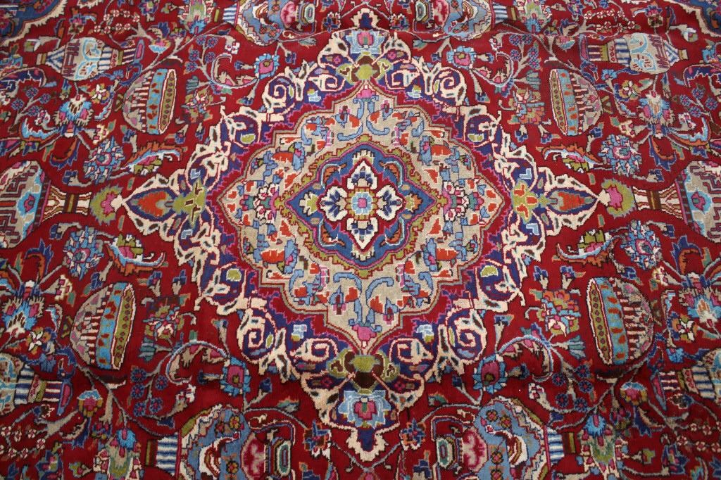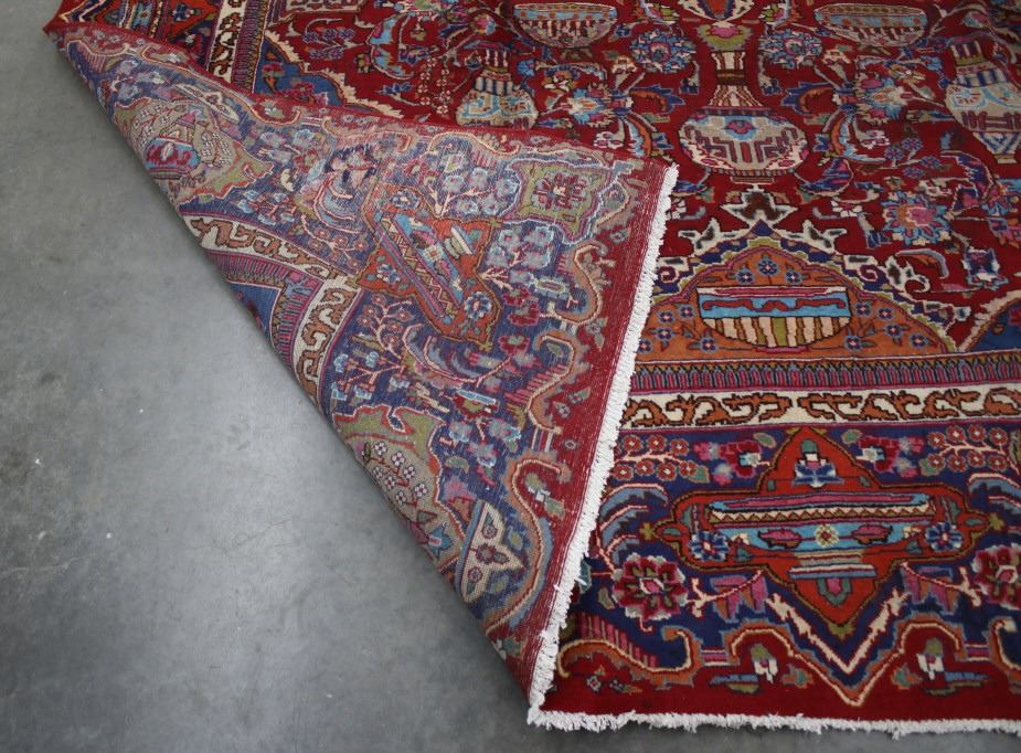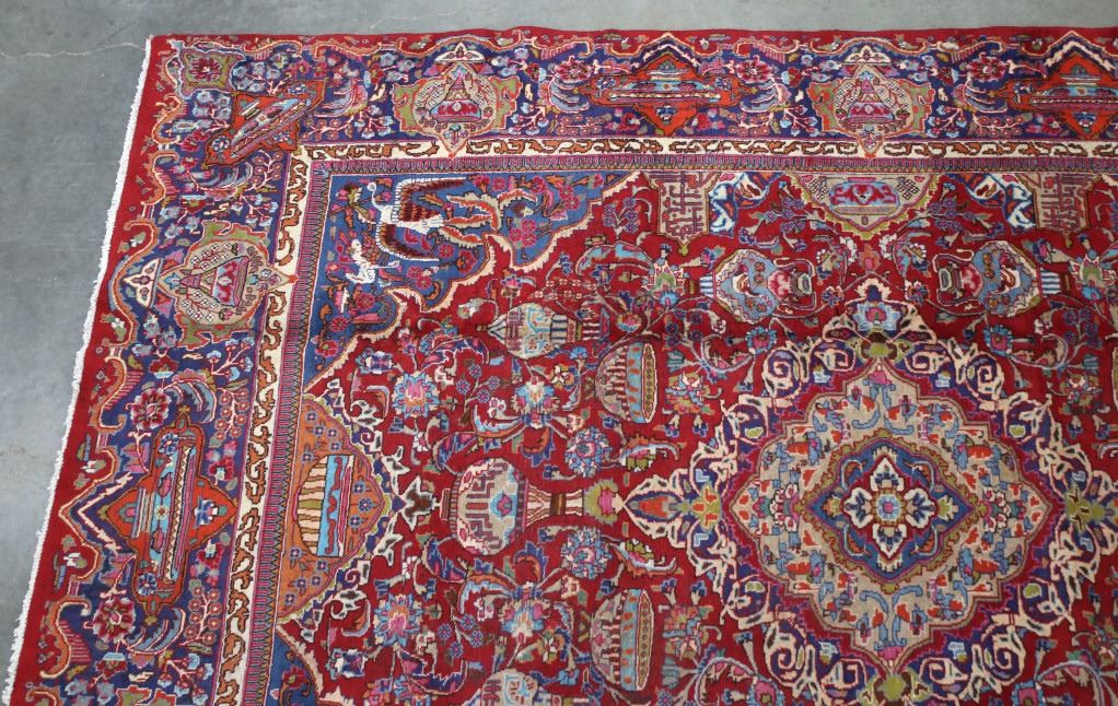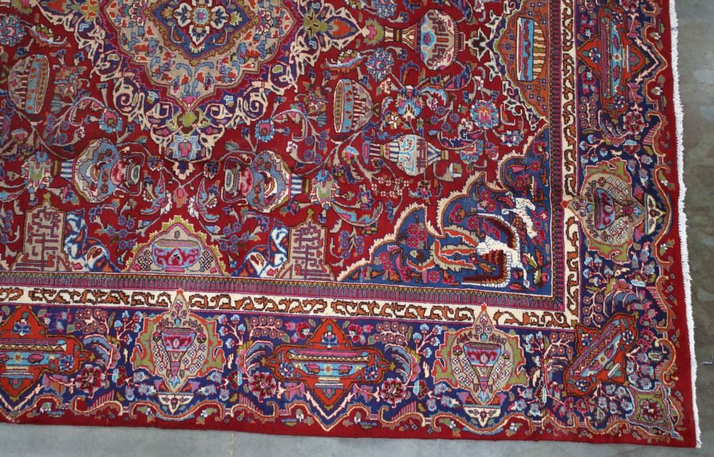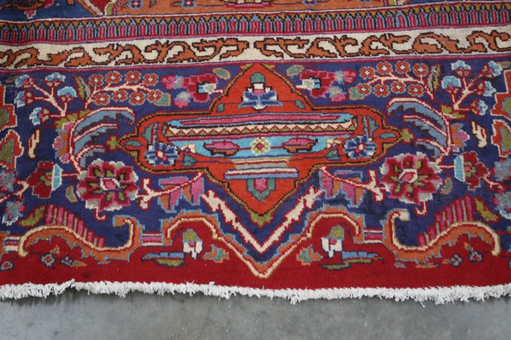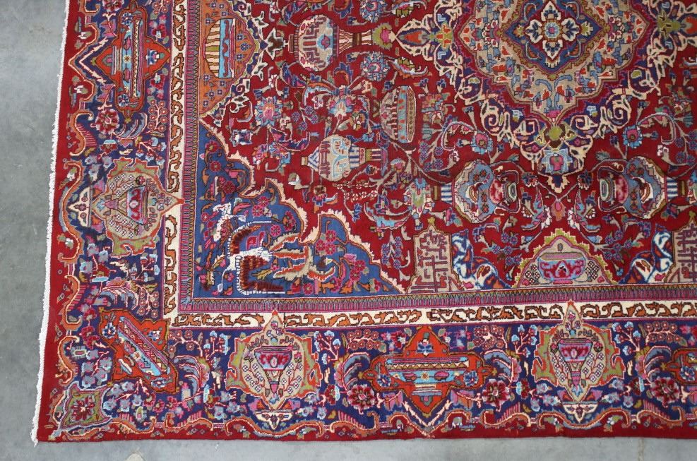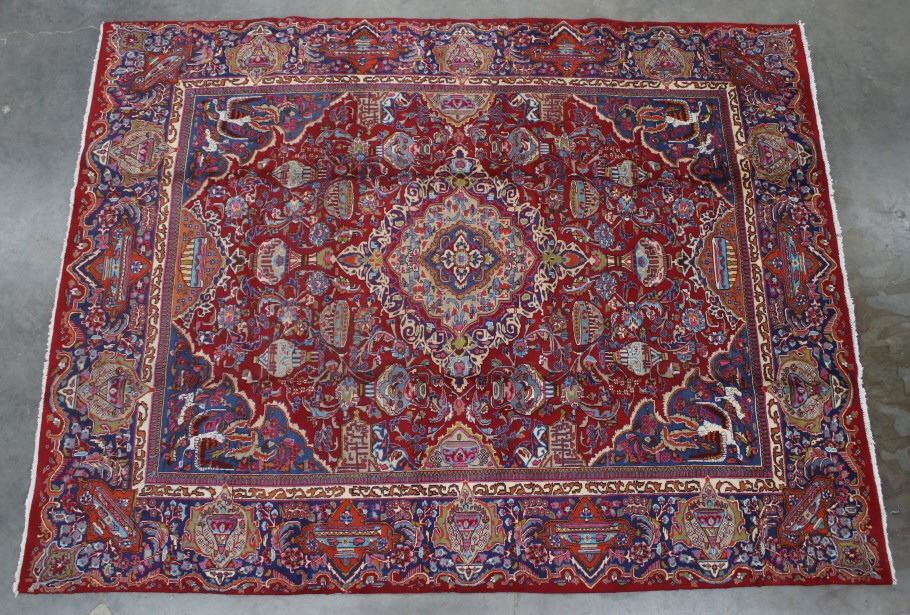Featured in this lot is a beautiful Persian Tabriz fine, hand woven wool area rug. The rug features a fine detailed design, bright colors, and a tight weave. A Tabriz rug/carpet is a type of rug in the general category of Persian carpets from the city of Tabriz, the capital city of East Azarbaijan Province, northwest of Iran. The city is totally populated by Azerbaijanis and is one of the oldest rug weaving centers, making a large diversity of carpet types. Tabriz has one of the most diverse displays of designs from medallion and Herati/Mahi to figural, pictorial, and even 3-d shaped rugs. The rug shows good condition overall, with some light wear due to age. The rug measures 117" wide by 153" long.