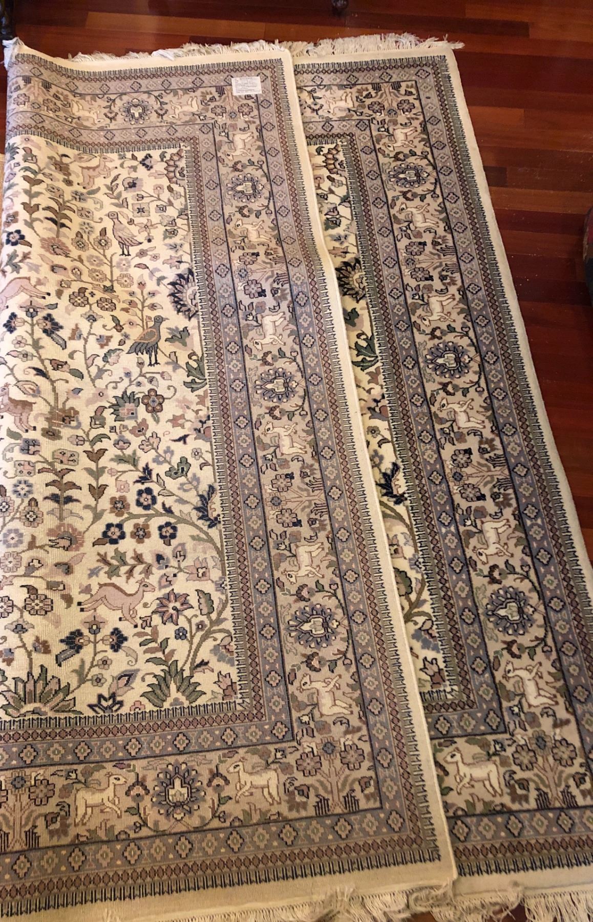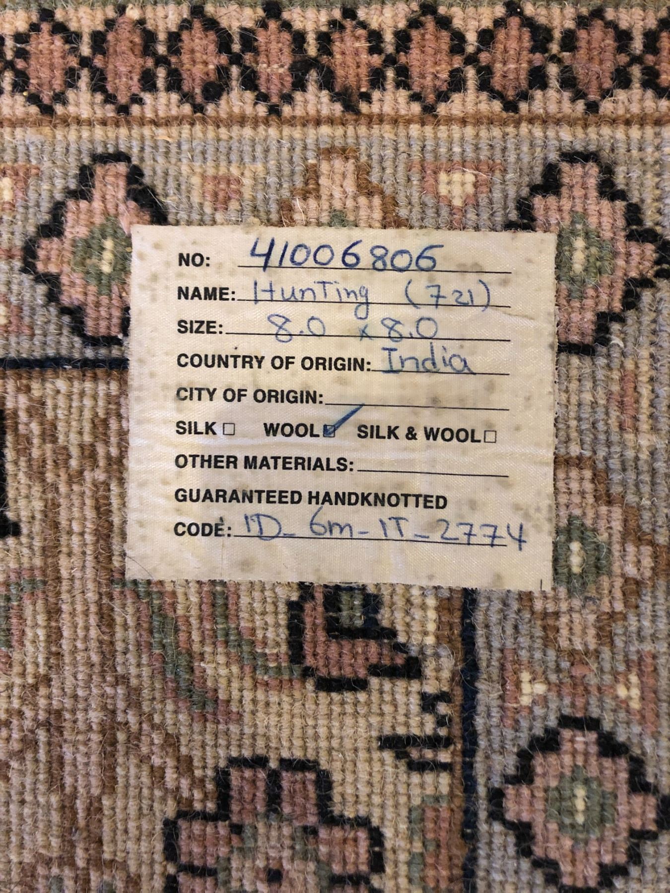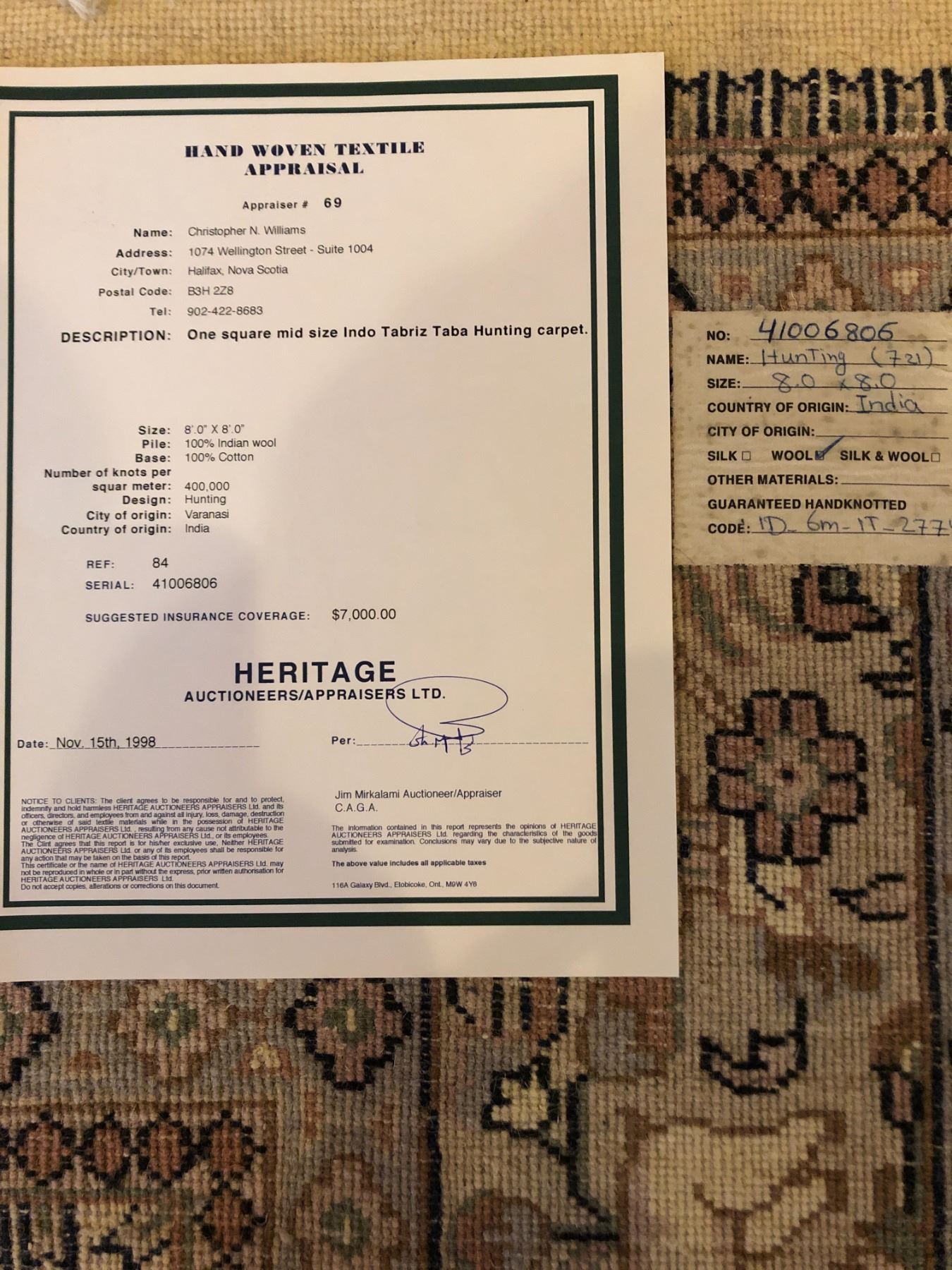 One square mid size Indo Tabriz Taba Hunting Carpet 8' x 8'. 100% Indian Wool, square meter 400,000 from Varanasi, India. Suggested Insurance Coverage $7,000 appraised by Heritage Auctioneers/Appraisers Ltd in 1998