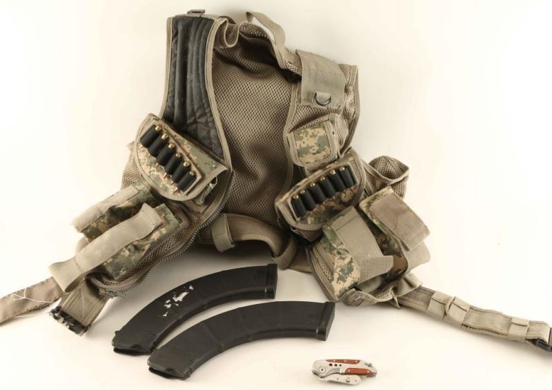 Green camo patterned vest that includes bullets, shells, mags, water bottle and multi-purpose tool. Appears to be a mens Large.
