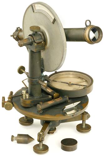 Tachymeter-Theodolit "Hildebrand" Gemarkt: "Hildebrand, Freiberg/Sa.", Nr. 11312, lackiertes Messing, mit Kompaß Ø 11 cm, 2 Libellen, Länge des Fernrohres 28 cm, versilberte Skalen, ohne Kasten (nur Bodenplatte). - Funktionierender unrestaurierter Originalzustand.