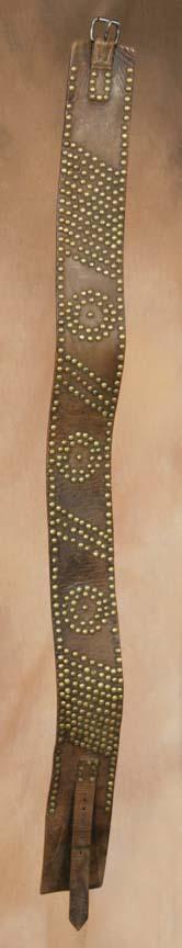 Northern Plains Tacked Leather Belt. 45" x 3 ½". Tacked design on commercial leather strip. 19th century. (est $1,000-2,000). For condition reports please visit: www.auctioninsantafe.com/cr2011.pdf