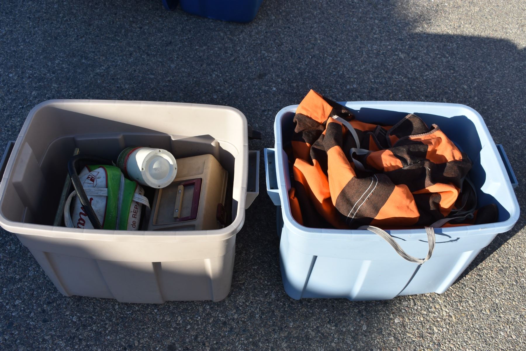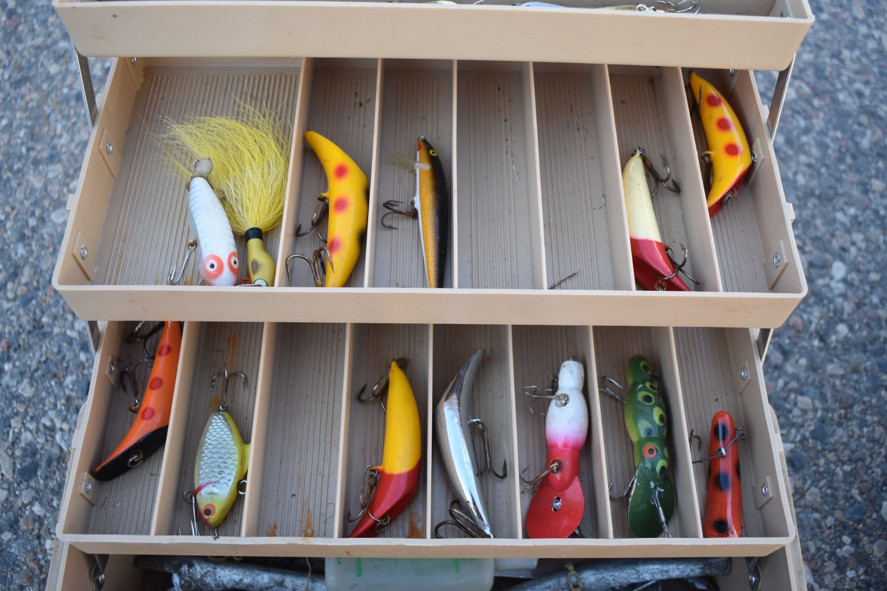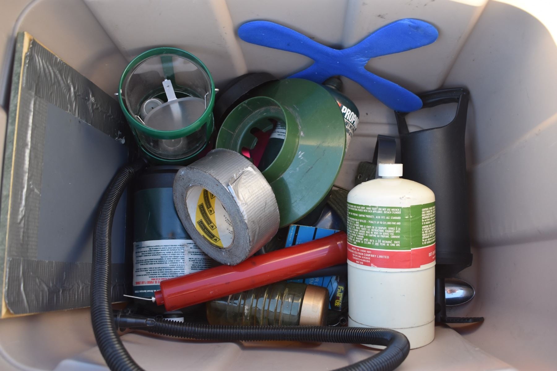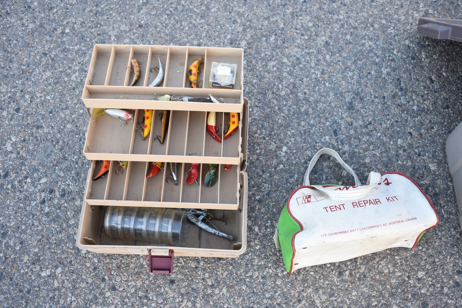 Tackle bix with lures, camping supplies, large canvas piece - in tote