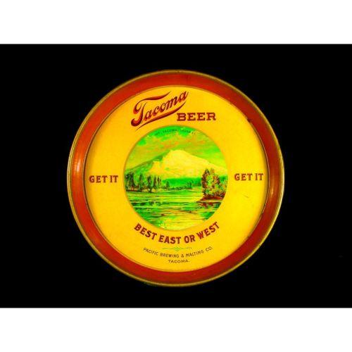 Tacoma Beer Tin Serving Tray, Pacific Brewing and Malting Co., Tacoma, WA, normal crazing otherwise very good condition, 12 inch diameter.