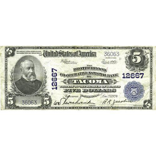 <B>Tacoma, WA</B></I> - $5 1902 Plain Back Fr. 609 <B>The Brotherhood-Cooperative NB</B></I> Ch. # 12667<BR>A nice grade large example from this union affiliated bank. Like most of these labor organized institutions, this bank failed to survive the Depression, with the receiver arriving to close the doors forever in February of 1932. <B>Fine-Very Fine.</B></I>