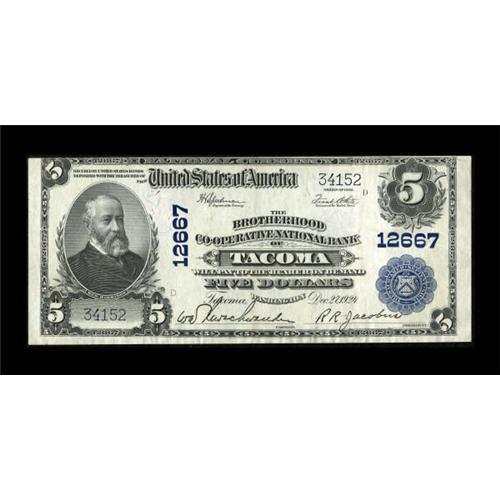 <B>Tacoma, WA</B></I> - $5 1902 Plain Back Fr. 609 <B>The Brotherhood-Cooperative NB</B></I> Ch. # 12667<BR> An attractive example from this popularly titled bank. The paper is bright, as is the overprint. <B>Very Fine.</B></I><BR><I>From The Kansas City Collection.</B></I><BR><BR><b>Shipping:</b> Coins & Currency (<a target="_blank" href="http://www.heritageauctions.com/common/shipping.php">view shipping information</a>)