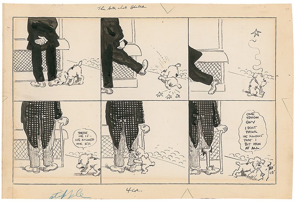 Cartoonist (1877–1929) best known for his Indoor Sports comics, and credited with popularizing numerous slang words. Original hand-drawn six-panel comic strip, dated 1913, on an off-white 14 x 9.5 sheet of heavy artist’s cardstock, signed in the final panel, “Tad.” Strip features a dispute between a man and a puppy, titled in the upper border, ‘The Bite That Failed.’ Lightly trimmed edges and toning and production marks to borders, otherwise fine condition.