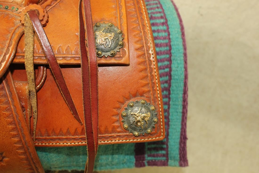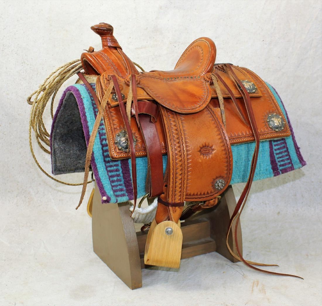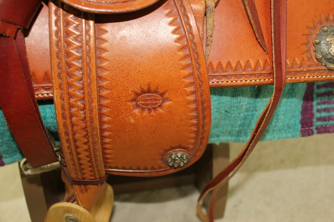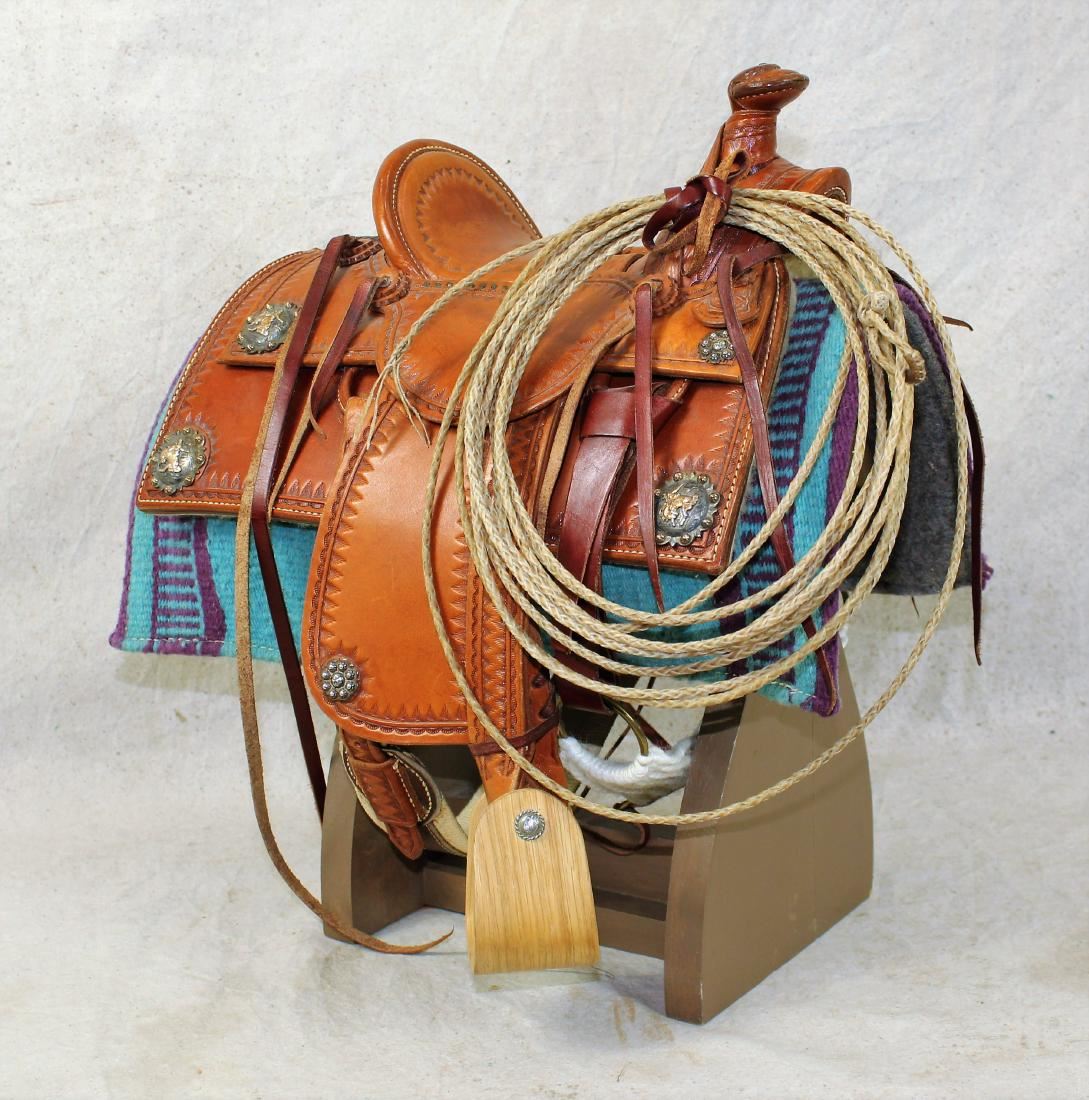 Example of fine craftsmanship, halfseat square skirt saddle with silver bucking horse concho cornerplates, a 6" seat with high cantle and Sam Stagg rigging, complete with wooden stirrups, cinch, and fantastic braided rawhide riata. Well marked on fenders, "Tad's Leather Shop Houston".