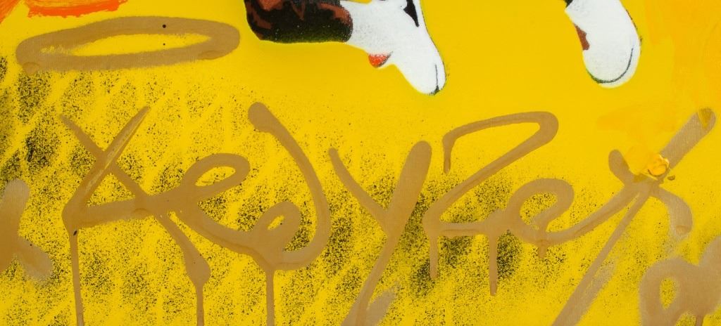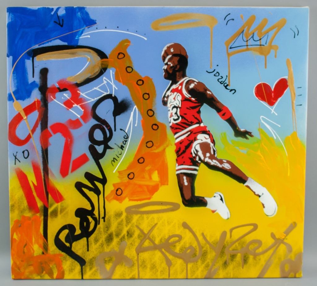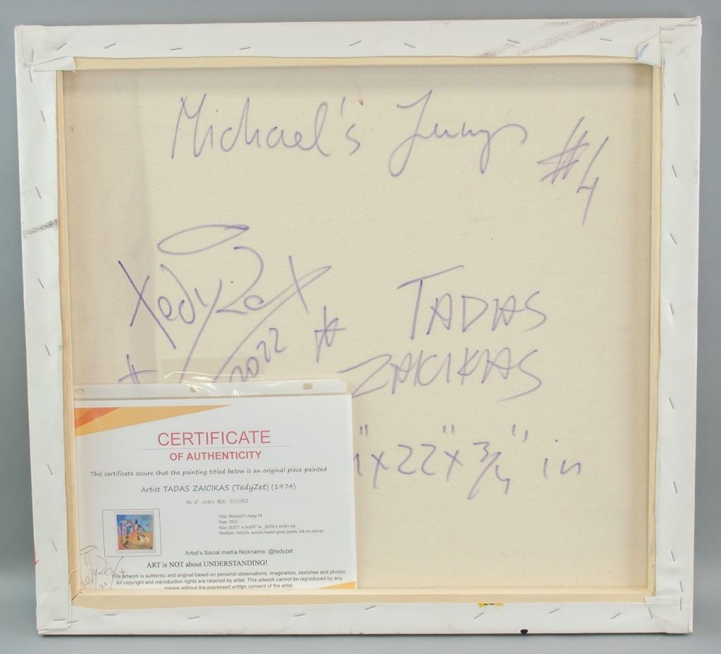 Acrylic and ink on canvas. Featuring Michael Jordan in mid-air, about the dunk. Signed by the artist, Tadas Zaicikas (Canadian-Lithuanian, b. 1973). Titled "Michael's Jump #4" on verso. Signed and dated by artist on verso. Accompanied with certificate of authentication. Provenance: from the artist. 56 x 61 cm (22 x 24 in).