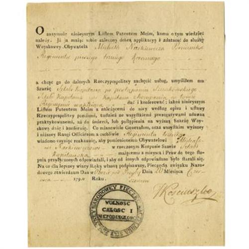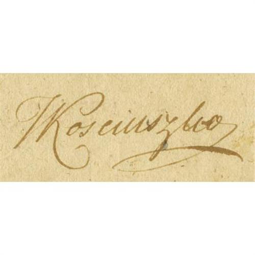 <B>Tadeusz Kosciuszko Partly Printed Document Signed</B></I> "<I>T Kosciuszko,</B></I>" one page, 6.5" x 8". Camp at Przybyszow, June 20, 1794. In Polish, translated. <B>Filled out by Kosciuszko.</B></I> In full, <I>"With this letter I declare that I nominate Lieutenant Michal Narkiewicz from First King's Regiment as a captain, being in effect after resignation of Captain Szczakowski. I know that he is an excellent soldier and I would like to encourage him to continue his service to Poland. This letter authorizes him to all the benefits, for his entire lifetime. I order all generals and all the other higher officers to recognize citizen Michal Narkiewicz as a new captain in First King's Regiment and order all the others to respect his new title. I confirm this with my signature and the official seal of National Alliance."</B></I> Official <I>"Wolnosc/ Calosc i/ Niepodleglosc" ("Liberty/ Unity and/ Independence")</B></I> seal stamped at bottom center. In 1772, weakened by a civil war, the Poland-Lithuania commonwealth agreed to a treaty signed by neighboring states Russia, Prussia, and Austria which resulted in the loss of about 25% of its territory and population. In 1793, Poland-Lithuania was forced to cede additional lands to Russia and Prussia. On March 24, 1794, in Krakow's Market Square, after being given total command of Polish forces, Tadeusz Kosciuszko called for a national uprising, promising to restore Poland's borders, sovereignty, and freedom. He quickly began to improve his army of 10,000 to 15,000, less than the number of Russian soldiers in Poland-Lithuania. Kosciuszko began a system of conscription with peasants added to existing regiments. The farmers straightened the angled blades of their scythes into straight points and formed the Kosinierzy (scythe-bearer) units. With 4,000 regular troops and 2,000 Kosinierzy, Kosciuszko marched towards Warsaw and, on April 4, 1794, at Raclawice, he met a larger Russian force led by General Tomasow. Using techniques he had learned in the American Revolution, Kosciuszko used his regular troops as a distraction while the Kosinierzy advanced unnoticed until they were a few hundred yards from Russian artillery. The Polish victory was swift. They captured the Russian cannons and pushed the enemy into retreat. Thousands of peasants throughout the commonwealth joined the Polish army. By the end of April, there were rebellions in Warsaw, Vilna, and other large towns. On May 7, 1794, Kosciuszko announced the Manifesto of Polaniec which reduced the number of serfs and the service time owed by peasants. In June, he led his army of 13,000 towards the Russian forces but, on June 6, 1794, opposed by the King of Prussia at the head of 40,000 men, he was defeated at Szczekociny. On June 15th, the Prussians took Krakow.<B> This military appointment was personally filled out and signed by Kosciuszko just five days later.</B></I> In September, Kosciuszko occupied Warsaw but he was defeated on October 10, 1794, in the Battle of Maciejowice and taken prisoner. In 1795, the Polish Republic experienced its third and final division and disappeared from the map of Europe. Almost 20 years earlier, while in France, Kosciuszko had been recruited by Silas Deane and Benjamin Franklin to come to America. He arrived in August 1776 and joined the Continental Army as a volunteer. On October 18, 1776, the Continental Congress "Resolved, That Thaddeus Kosciuszko, Esq., be appointed an engineer in the service of the United States, with the pay of sixty dollars a month, and the rank of colonel." In 1783, in recognition of his dedicated and faithful service, recommended by Secretary at War Benjamin Lincoln, he was brevetted by the Continental Congress to the rank of brigadier general. There is a minor tear at the bottom repaired on verso. In America, Kosciuszko fought in a revolution; in 1794, he led one. This document was penned during the Kosciuszko Uprising. It would make a superb addition to any military collection. With light folds, it is in very fine condition.<BR><BR><b>Shipping:</b> Flat Material, Small (<a target="_blank" href="http://www.heritageauctions.com/common/shipping.php">view shipping information</a>)