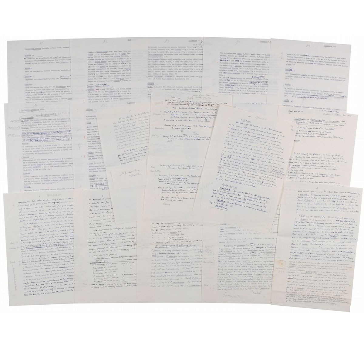 Polish-Swiss chemist (1897–1996) awarded the Nobel Prize in Physiology or Medicine in 1950 for his work on hormones of the adrenal cortex which culminated in the isolation of cortisone. He later became interested in the phytochemistry and cytology of ferns, publishing at least 80 papers on these subjects in the last three decades of his life. Impressive autograph manuscript, comprised of nine handwritten pages and nine hand-edited typed pages, 8.25 x 11.75, published in the magazine Webbia in December 1978. A draft manuscript by Reichstein entitled “Identification of Cheilanthes frapans var. Gennarii Fiori with C. guanchica Bolle and remarks on related taxa,” signed below for himself and two contributors, “E. Nardi, Helga Rasbach, T. Reichstein.” A complex article on ferns, beginning: “Until recently the following six taxa of the fern genus Cheilanthes were recorded in Europe…The two first mentioned have often been placed in a separate genus (Notholaena) and some experts still prefer to follow this precedent.” Also accompanied by a slip signed by Reichstein. In fine condition, with expected wear for a working draft.