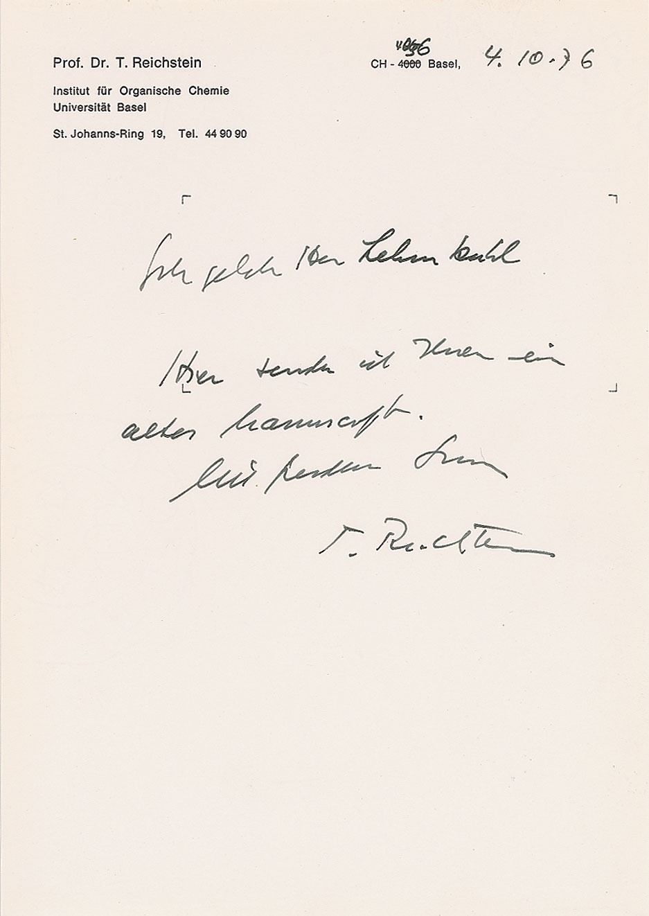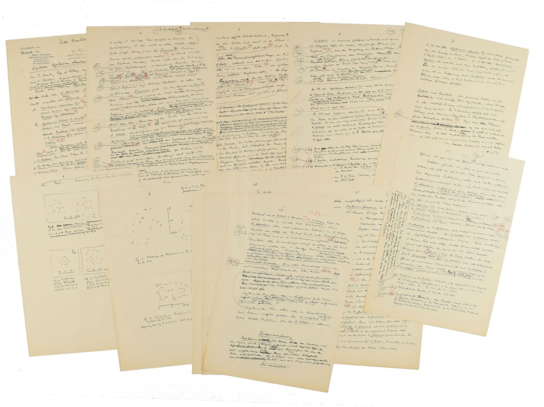Polish-Swiss chemist (1897–1996) awarded the Nobel Prize in Physiology or Medicine in 1950 for his work on hormones of the adrenal cortex which culminated in the isolation of cortisone. Handwritten manuscript by Reichstein, headed "Diploides Asplenium obovatum," sixteen pages, 8.25 x 11.75, with handwritten cover letter signed "T. Reichstein," dated October 4, 1976. Manuscript pertaining to the article authored by by Tadeusz Reichstein and Ivor Manton on Aspleniaceae, a family of ferns, which had been published in 1962 in 'Bauhina,' the journal of the Basel Botanical Society. Includes various hand-drawn diagrams, and a few pages mostly blank. In fine condition. Accompanied by the original mailing envelope.