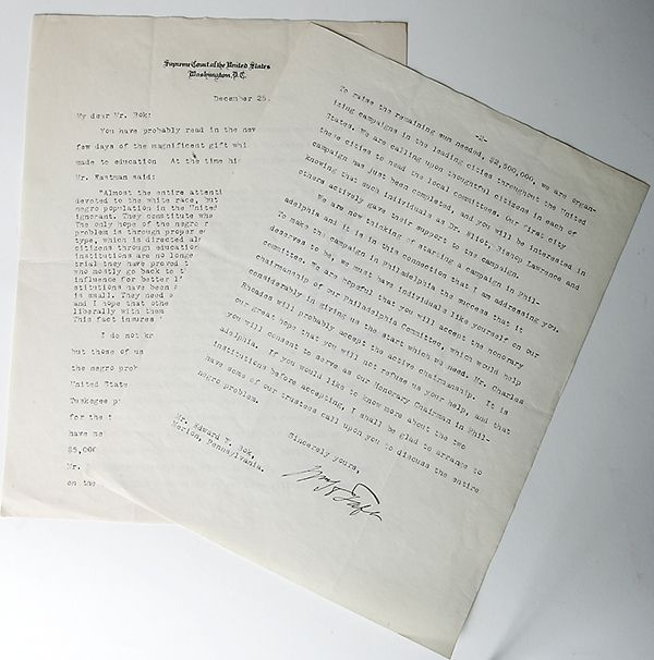 Taft, William H (1857-1930) 27th President of the United States (1909-13); Chief Justice of the U.S. Supreme Court (1921-30). Typed letter signed ("Wm H. Taft") as Chief Justice, 2 pages, on "Supreme Court of the United States" letterhead, 8 x 10½ in., Washington, D.C., Dec. 25, 1924. To Edward W. Bok (1863-1930), reform-minded Dutch American editor and publisher who was editor of the very influential magazine, "The Ladies Home Journal," for 30 years (1889-1919); Bok won the Pulitzer Prize in 1921 for his autobiography, "The Americanization of Edward Bok." Taft refers to a $2,000,000 gift made by George Eastman (of Eastman Kodak) for "negro" education, as part of a $5,000,000 fundraising goal, and quotes Eastman: "Almost the entire attention of educators has been this far devoted to the white race, but we have more than 10 per cent negro population in the United States, most of whom are densely ignorant. They constitute what is known as the negro problem…."