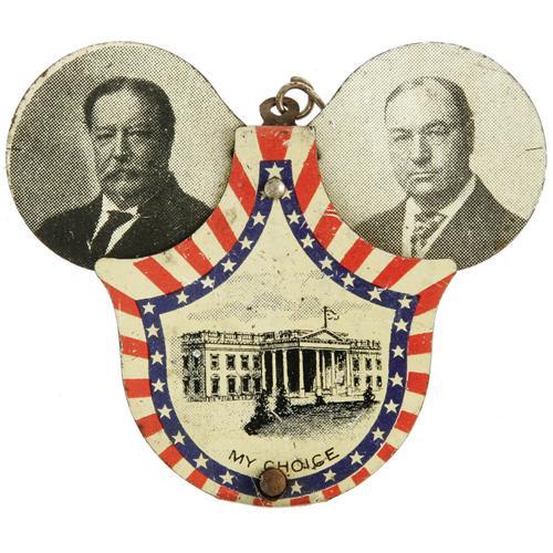 <B>Rare 1908 Taft & Sherman Lithographed Tin Mechanical Badge.</B></I> Their portraits pop out from behind a shield-shaped pin bearing an image of the White House and the words "My Choice." Excellent condition, one of the cleanest examples we have encountered. 2.25" x 1.9". <I>From the Norman Loewenstern Collection.</B></I>