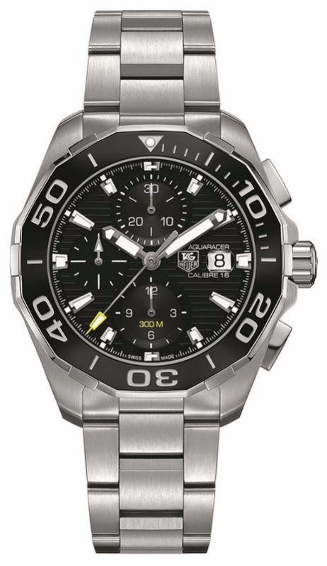 Model: CAY211A.BA0927 - CASE = [Material:Stainless Steel], [Case Diameter:43], [Bezel:Uni-Directional Rotating], [Case Back:Solid], [Water Resistant:300 Meters/1000 Feet], [Crystal:Scratch Resistant Sapphire],; DIAL = [Color:Black],; MOVEMENT = [Type:Automatic Chronograph], [Crown:Screw Down],; BAND = [Clasp:Folding], [Type:Stainless Steel], (Usually ships in 1 to 2 business days.)