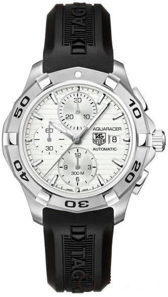 Model: CAP2111.FT6028 - CASE = [Material:Brushed and Polished Stainless Steel], [Case Diameter:42], [Bezel:Uni-Directional Rotating with 60 Min. Scale, Fixed 60 Min. Scale on Inner], [Case Back:Solid], [Water Resistant:300 Meters - 1000 Feet], [Crystal:Scratch Resistant Sapphire], DIAL = [Color:Silver Horizontal Linear Designed Chronograph with Luminescent Index Markers and Date at 4], MOVEMENT = [Type:Automatic Self Winding], [Crown:Screw Down], BAND = [Clasp:Deployment Buckle], [Type:Black Rubber], (Usually ships in 1 to 2 weeks.)