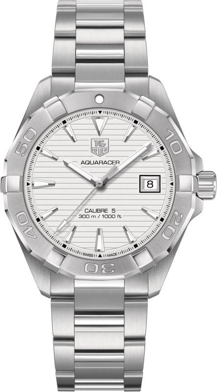Model: WAY2111.BA0910 - CASE = [Material:Brushed and Polished Stainless Steel], [Case Diameter:40.5], [Bezel:Uni-Directional Rotating, Engraved with 60 Minute Scale], [Case Back:Solid], [Water Resistant:300 Meters / 1000 Feet], [Crystal:Scratch Resistant Sapphire], DIAL = [Color:Silver Linear Design with Date at 3], MOVEMENT = [Type:Automatic Self Winding Calibre 5 with 38 to 46 Hour Power Reserve], [Crown:Screw Down], BAND = [Clasp:Deployment Buckle], [Type:Brushed and Polished Stainless Steel], (In Stock - Ready to ship.)
