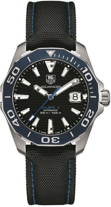 Model: WAY211B.FC6363 - CASE = [Material:Stainless Steel], [Case Diameter:41], [Bezel:Uni-Directional Rotating], [Case Back:Solid], [Water Resistant:300 Meters - 1000 Feet], [Crystal:Scratch Resistant Sapphire], DIAL = [Color:Black], MOVEMENT = [Type:Automatic], [Crown:Screw Down], BAND = [Clasp:Tang], [Type:Black With Blue Stiching Fabric], (Usually ships in 1 to 2 business days.)