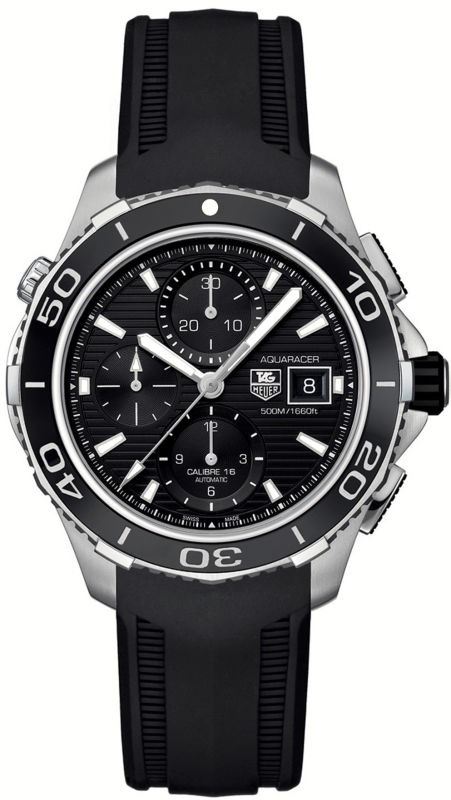 Model: CAK2110.FT8019 - CASE = [Material:Brushed and Polished Stainless Steel], [Case Diameter:43], [Bezel:Black Ceramic], [Case Back:Solid], [Water Resistant:500 Meters - 1650 Feet], [Crystal:Scratch Resistant Sapphire],; DIAL = [Color:Black],; MOVEMENT = [Type:Automatic Self Winding Calibre 16],; BAND = [Clasp:Tang], [Type:Black Rubber], (In Stock - Ready to ship.)