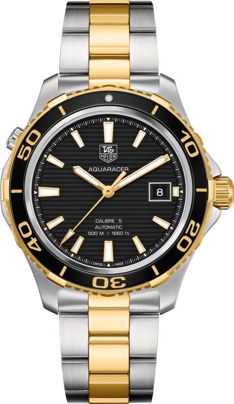 Model: WAK2122.BB0835 - CASE = [Material:Brushed Stainless Steel and Polished 18K Yellow Gold], [Case Diameter:41], [Bezel:Yellow Gold with Black Ceramic], [Case Back:Solid], [Water Resistant:500 Meters - 1650 Feet], [Crystal:Scratch Resistant Sapphire], DIAL = [Color:Black], MOVEMENT = [Type:Automatic Self Winding Calibre 5], BAND = [Clasp:Deployment Buckle], [Type:Brushed Stainless Steel and Polished 18K Yellow Gold], (In Stock - Ready to ship.)