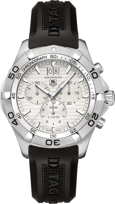 Model: CAF101F.FT8011 - CASE = [Material:Brushed and Polished Stainless Steel], [Case Diameter:43], [Bezel:Rotating], [Case Back:Solid], [Water Resistant:300 Meters / 1000 Feet], [Crystal:Scratch Resistant Sapphire], DIAL = [Color:Silver Horizontal Linear Designed Chronograph with Luminescent Index Markers and Grande Date at 12], MOVEMENT = [Type:Battery Powered Quartz], [Crown:Screw Down], BAND = [Clasp:Tang Buckle], [Type:Black Rubber], (In Stock - Ready to ship.)