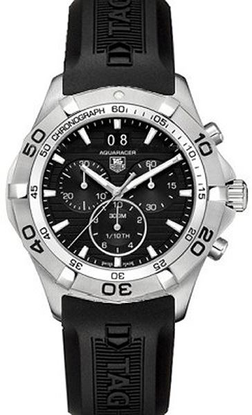 Model: CAF101E.FT8011 - CASE = [Material:Brushed and Polished Stainless Steel], [Case Diameter:43], [Bezel:Uni-Directional Rotating with 60 Min. Scale, Fixed 60 Min. Scale on Inner], [Case Back:Solid], [Water Resistant:300 Meters - 1000 Feet], [Crystal:Scratch Resistant Sapphire], DIAL = [Color:Black Horizontal Linear Designed Chronograph with Luminescent Index Markers and Grande Date at 12], MOVEMENT = [Type:Battery Powered Quartz], [Crown:Screw Down], BAND = [Clasp:Tang Buckle], [Type:Black Rubber], (In Stock - Ready to ship.)
