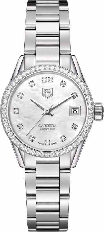 Model: WAR2415.BA0770 - CASE = [Material:Polished Stainless Steel], [Case Diameter:28], [Bezel:Fixed, Set with 56 Top Wesselton Diamonds (Total Weight 0.55ct)], [Case Back:See-Thru sapphire Crystal], [Water Resistant:100 Meters / 330 Feet], [Crystal:Scratch Resistant Sapphire],; DIAL = [Color:White Mother of Pearl with 12 Dimaond Hour Markers (Total Weight 0.10ct), Date at 3],; MOVEMENT = [Type:Automatic Self Winding Calibre 9 with 42 Hour Power Reserve],; BAND = [Clasp:Deployment Buckle], [Type:Polished Stainless Steel], (Usually ships in 2 to 4 weeks.)