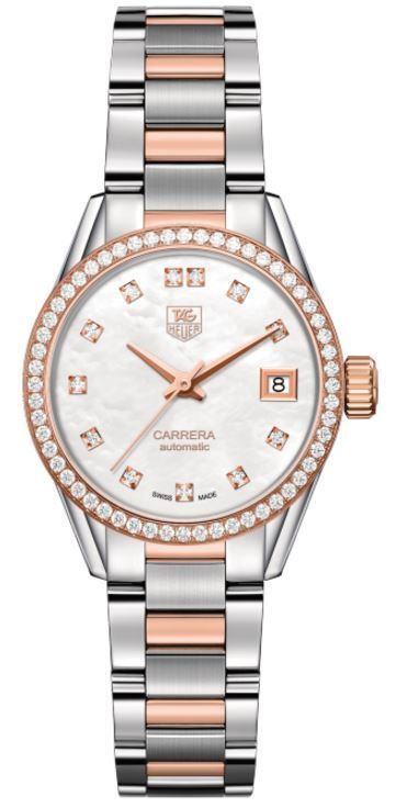 Model: WAR2453.BD0777 - CASE = [Material:18kt Rose Gold and Stainless Steel], [Case Diameter:28], [Bezel:Fixed], [Case Back:Skeleton], [Water Resistant:100 Meters - 330 Feet], [Crystal:Scratch Resistant Sapphire], DIAL = [Color:Mother of Pearl with Rose Gold Hands and Diamond Hour Markers], MOVEMENT = [Type:Automatic], [Crown:Push In], BAND = [Clasp:Folding], [Type:Stainless Steel and Rose Gold], (Usually ships in 1 to 2 weeks.)