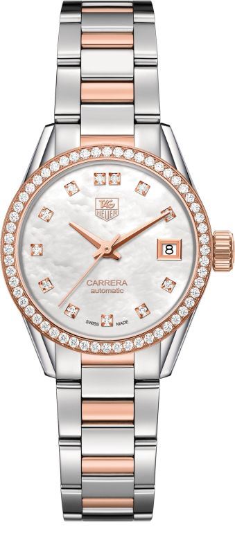 Model: WAR2453.BD0772 - CASE = [Material:Polished Stainless Steel and Rose Gold], [Case Diameter:28], [Bezel:Fixed Solid 18k Rose Gold, Set with 56 Top Wesselton Diamonds (Total Weight 0.55ct)], [Case Back:See-Thru sapphire Crystal], [Water Resistant:100 Meters / 330 Feet], [Crystal:Scratch Resistant Sapphire], DIAL = [Color:White Mother of Pearl with 12 Diamond Hour Markers (Total Weight 0.10ct), Date at 3], MOVEMENT = [Type:Automatic Self Winding Calibre 9 with 42 Hour Power Reserve], BAND = [Clasp:Deployment Buckle], [Type:Polished Stainless Steel and Rose Gold], (Usually ships in 2 to 4 weeks.)