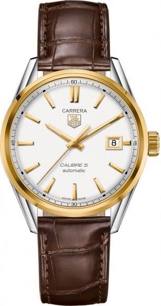Model: WAR215B.FC6181 - CASE = [Material:Polished Stainless Steel], [Case Diameter:39], [Bezel:Solid 18k Yellow Gold], [Case Back:See-thru Sapphire Crystal], [Water Resistant:100 Meters/330 Feet], [Crystal:Scratch Resistant Sapphire], DIAL = [Color:Silver with Day at 3, Yellow Gold Tone Hands and Markers], MOVEMENT = [Type:Automatic Self Winding Winding Calibre 5 with Approx. 38Hr. Power Reserve], [Crown:Winding], BAND = [Clasp:Deployment], [Type:Brown Alligator Leather], (In Stock - Ready to ship.)