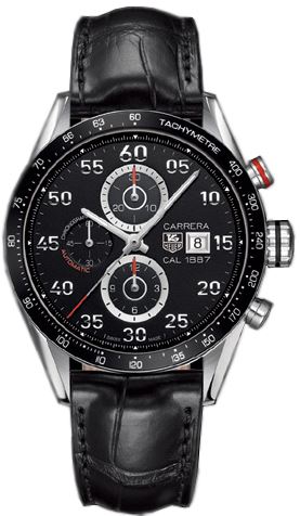 Model: CAR2A10.FC6235 - CASE = [Material:Polished Stainless Steel], [Case Diameter:43], [Case Thickness:16mm], [Bezel:Ceramic, Tachmeter Scale], [Case Back:See-Thru Sapphire Crystal], [Water Resistant:100 Meters - 330 Feet], [Crystal:Scratch Resistant Sapphire], DIAL = [Color:Black Red Accented Chronograph with dat at 3], MOVEMENT = [Type:Automatic Self Winding Calibre 1887], BAND = [Clasp:Deployment Buckle], [Type:Black Crocodile Leather], (In Stock - Ready to ship.)